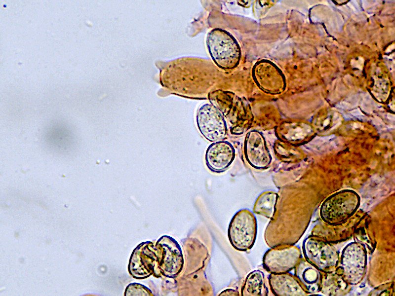 Les spores me donnent toujours 9-10 µm en longueur et peut-être les avais-je surévaluées en largeur : je trouve vers 5.5-6 µm mis à part pour une ou deux très grosses spores.