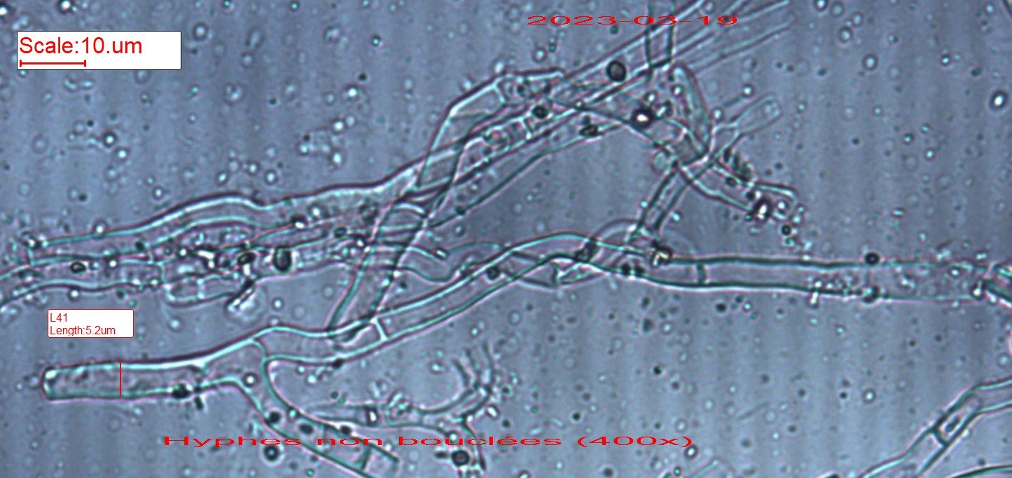 Pour satisfaire la curiosité de Fouad, les hyphes du subiculum non bouclées qui excluent aussi Phlebia tremellosa.