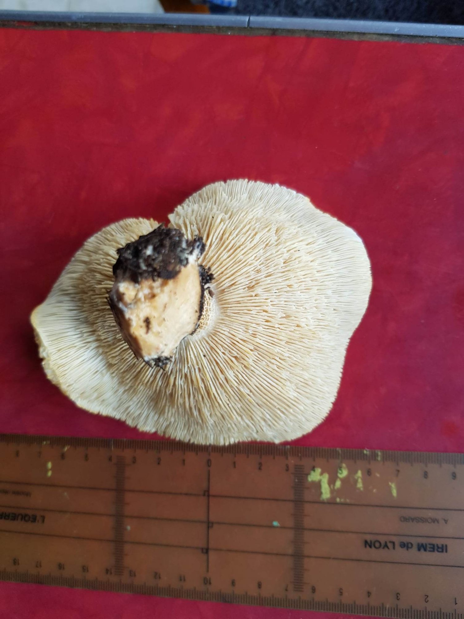 Le chapeau mesure environ 8/10 cm. Le mamelon a presque disparu mais était bien présent. Ce que je ne retrouve dans aucune description, c'est la couleur jaunissante - ainsi que le pied moucheté de brun / noir (je crois que c'est apparu uniquement en vieillissant). Je précise aussi que j'ai trop attendu avant de le cueillir, il s'agit d'un vieil individu. J'ai hâte qu'il pousse à nouveau pour récolter plus d'informations sur un jeune.