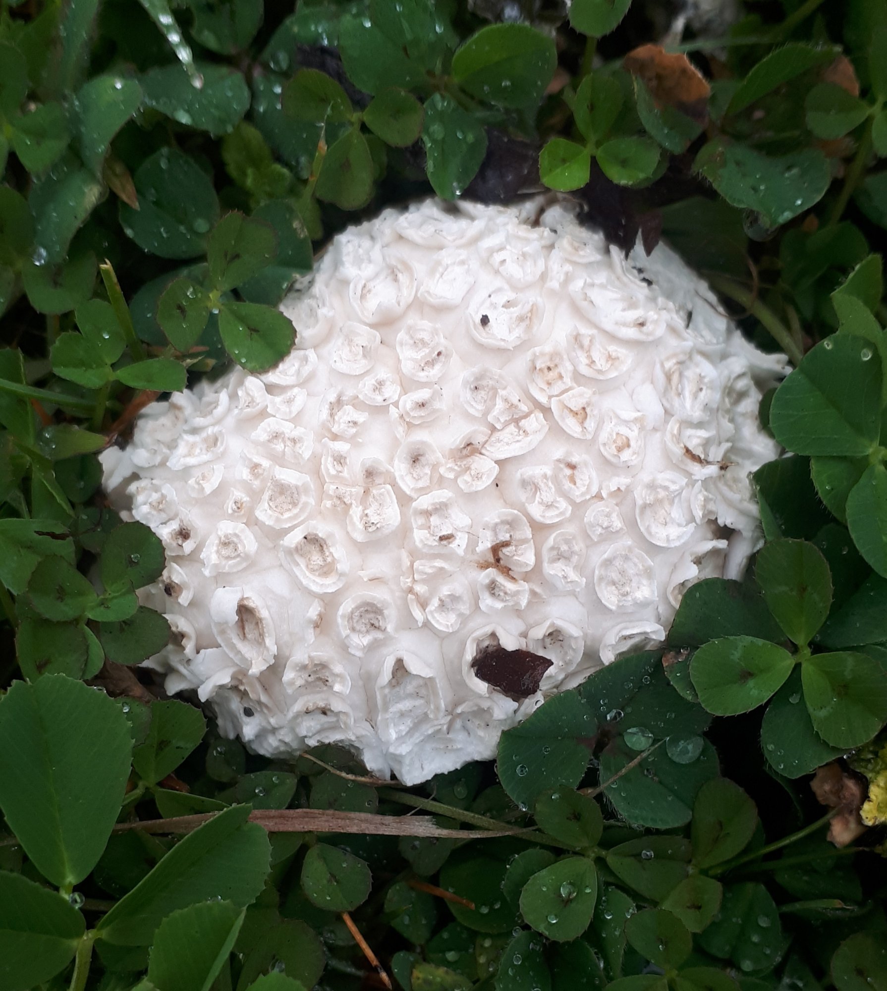 J'ai d'abord cru que la chose en question était un bébé-pholiote, mais ce ne sont pas des écailles qu'on voit ici.