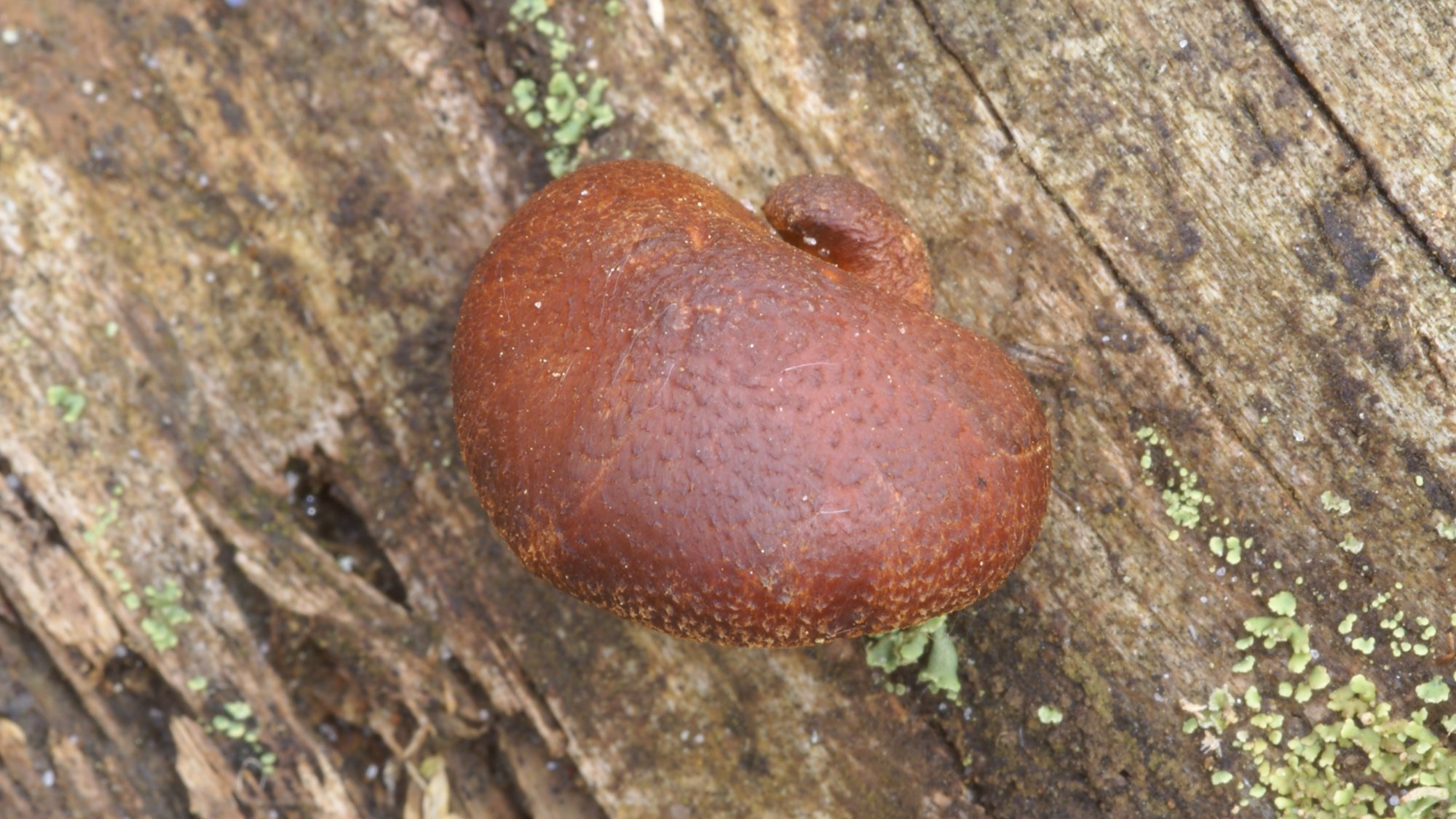 Chapeau : Brun-roux, sec, avec de minuscules verrucosités. Réniforme (mais probablement déformé par la présence du 2ème exemplaire plus petit), 2 cm dans sa plus grande dimension, environ 1,5 cm dans sa largeur. La marge semble enroulée (voir photos 2 et 3).