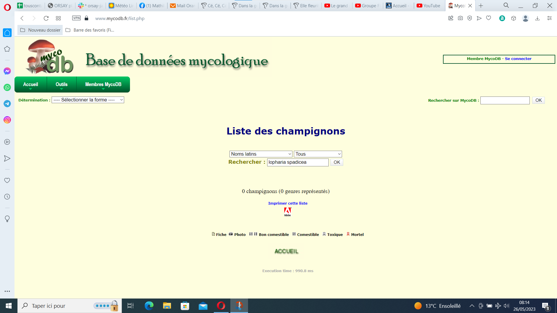 25 mai 2023, 21:44Cécile a écrit : Le nom que j'avais en tête n'a pas ces initiales, je l'ai tapé dans le cadre "recherche" de mycodb et il n'y a pas d'espèce correspondant à ce nom.??? Tu as tapé quoi, exactement ?