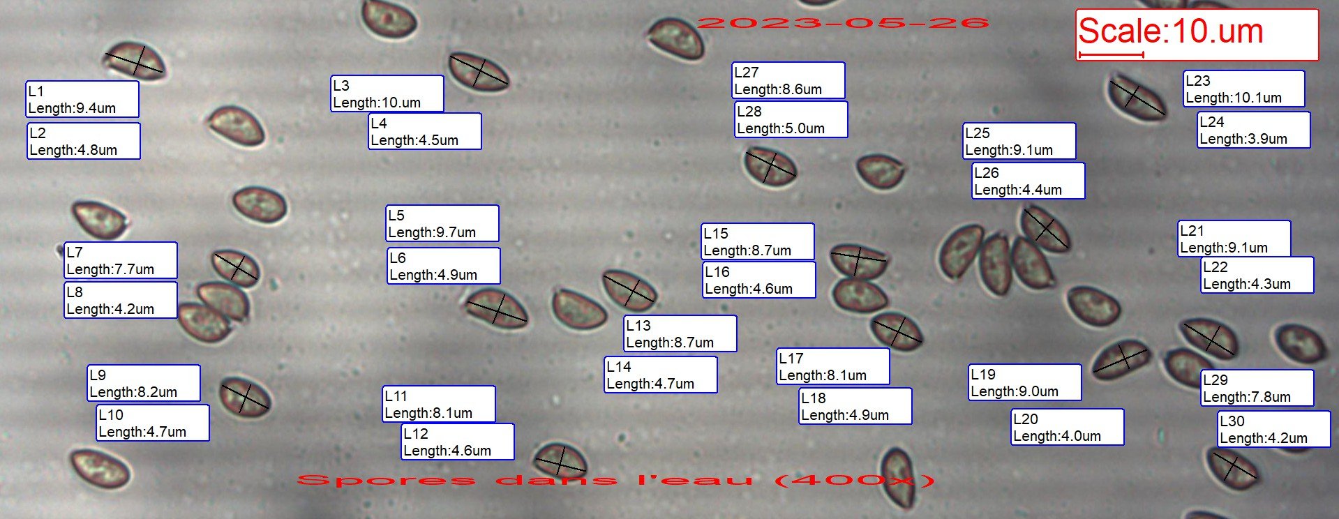 Spores amygdaliformes, 7.5 - 10 x 4 - 5 µ