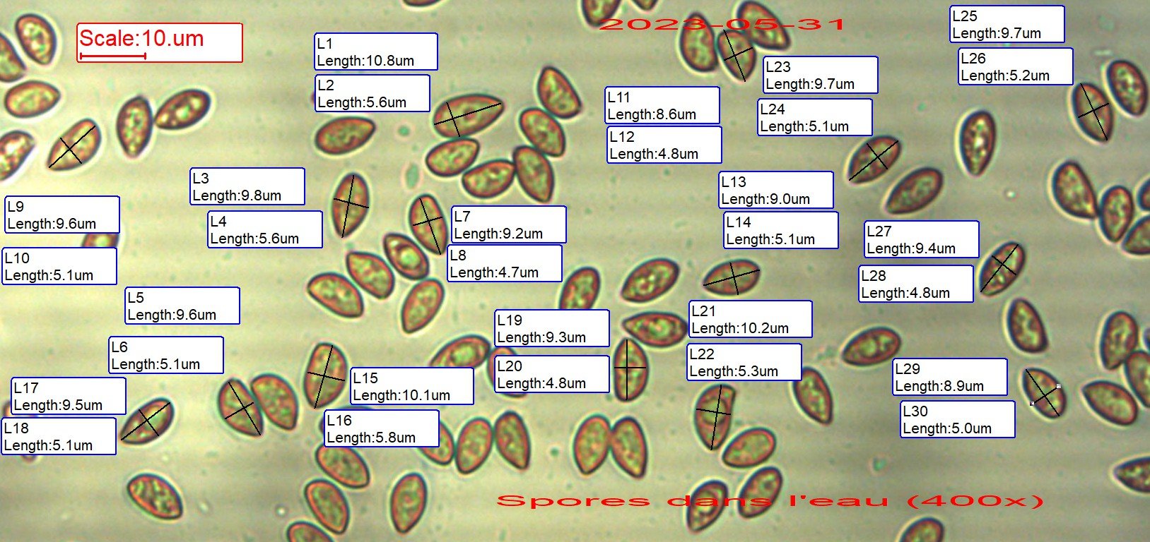 Spores amygdaliformes avec un sommet appointi. Cheilocystides et pleurocystides (sablées ?) identiques, NH4OH+. Caulocystides en proportion plus épaisses.