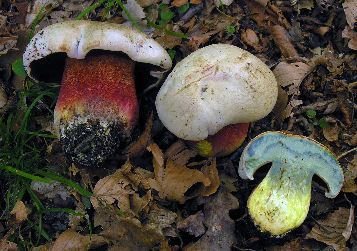 La chair jaune,immuable dans une bonne partie du pied, s'opposant au bleuissement de celle du chapeau, et le réseau à mailles rouge carmin qui laisse entrevoir sur un exemplaire adulte la chair sous-jacente constituent entre autres de solides caractéristiques de ce bolet. Bravo pour la qualité des photos et notamment celle de l'indispensable coupe pour les bolets de la section Luridi.