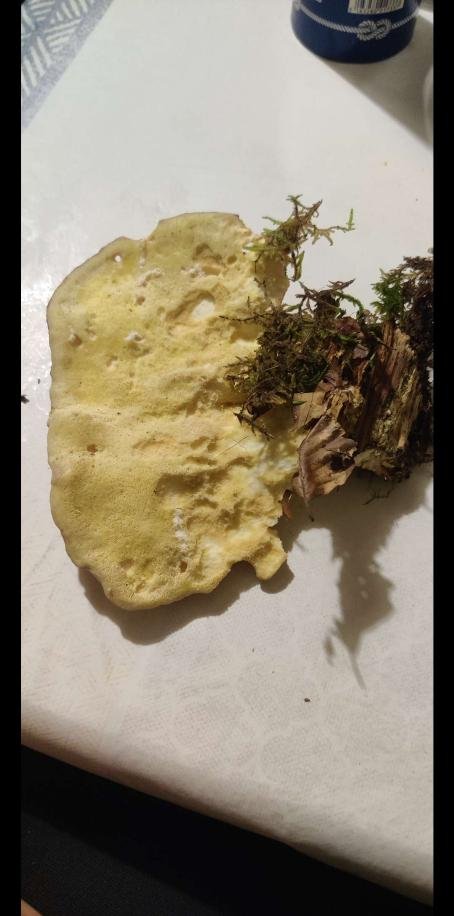 Je pense avoir affaire à un Laetiporus mais sans certitude comme ça ne remplit pas tous les critères (éventuellement Laetiporus montanus), mais j'ai l'impression que les espèces européennes ne sont pas bien décrites après quelques recherches