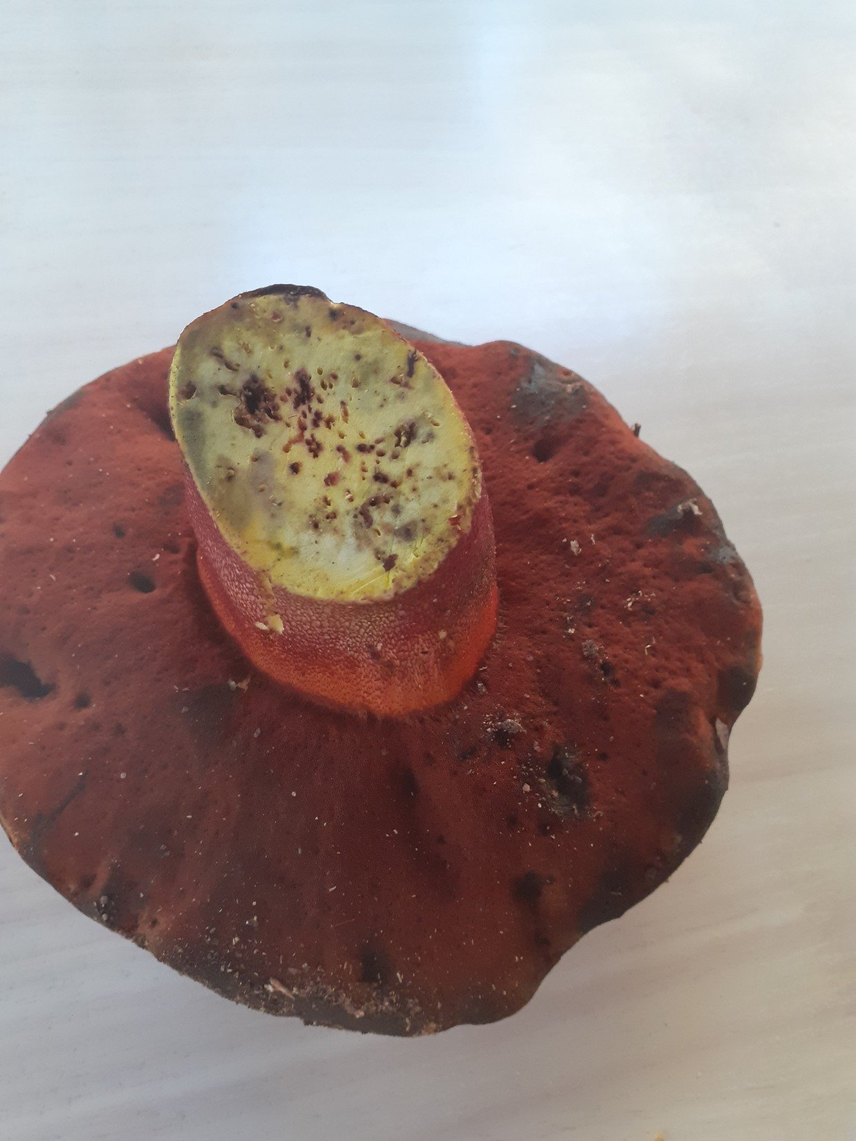 Juste une question sur la proposition de Nommo, sur Mycodb la chair est censée bleuir à la coupe, ce qui ne semble pas être le cas sur le pied coupé de notre spécimen. Cela invalide-t-il sa proposition ?