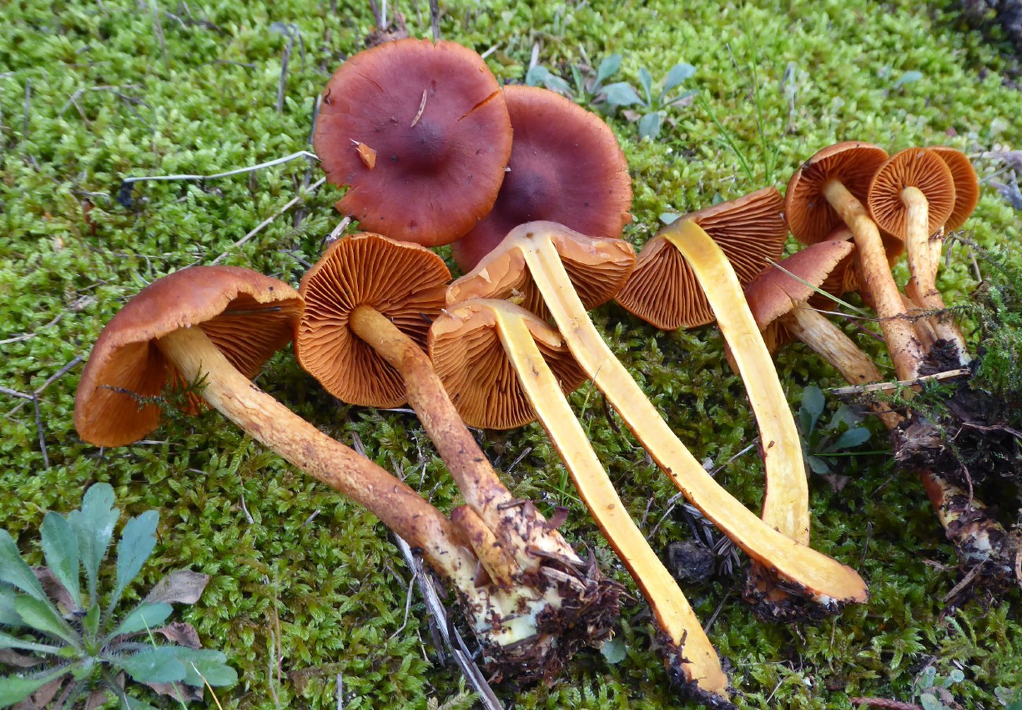Je suis retourné dans cette pessière humide et je peux exclure l'hypothèse Cortinarius uliginosus. Ce champignon est très répandu à l'intérieur. Pas de saules aux endroits où il abonde. Les lames ne sont pas jaunes, mais d'un bel orangé cannelle, même chez les jaunes exemplaires. Les chapeaux sont toujours avec des tonalités brun-rouge prononcées. La chair est jaune (non olive foncé). KOH toujours comme ci-dessus. Cortinarius cinnamomeus pourrait -il convenir ? Merci.