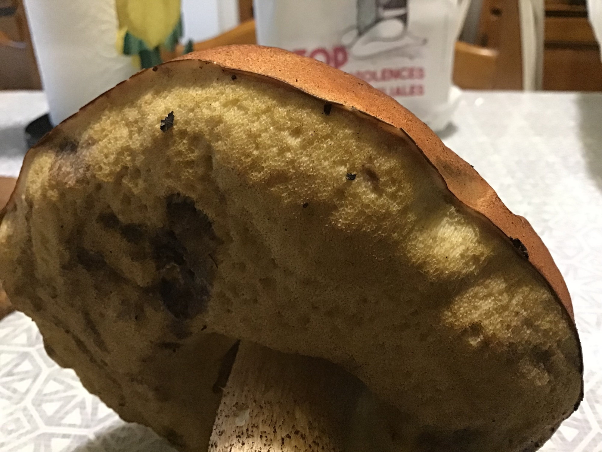 Donc voici mon candidat le plus proche, Leccinum nigellum, mais je ne suis pas convaincu à 100%, ils disent dans les commentaires, chair virant au violé ardoisé à la coupe, plutôt gris ardoisé dans mon cas, et les pores crème sont plutôt jaunâtre mais le spécimen que j'ai semble assez vieux.