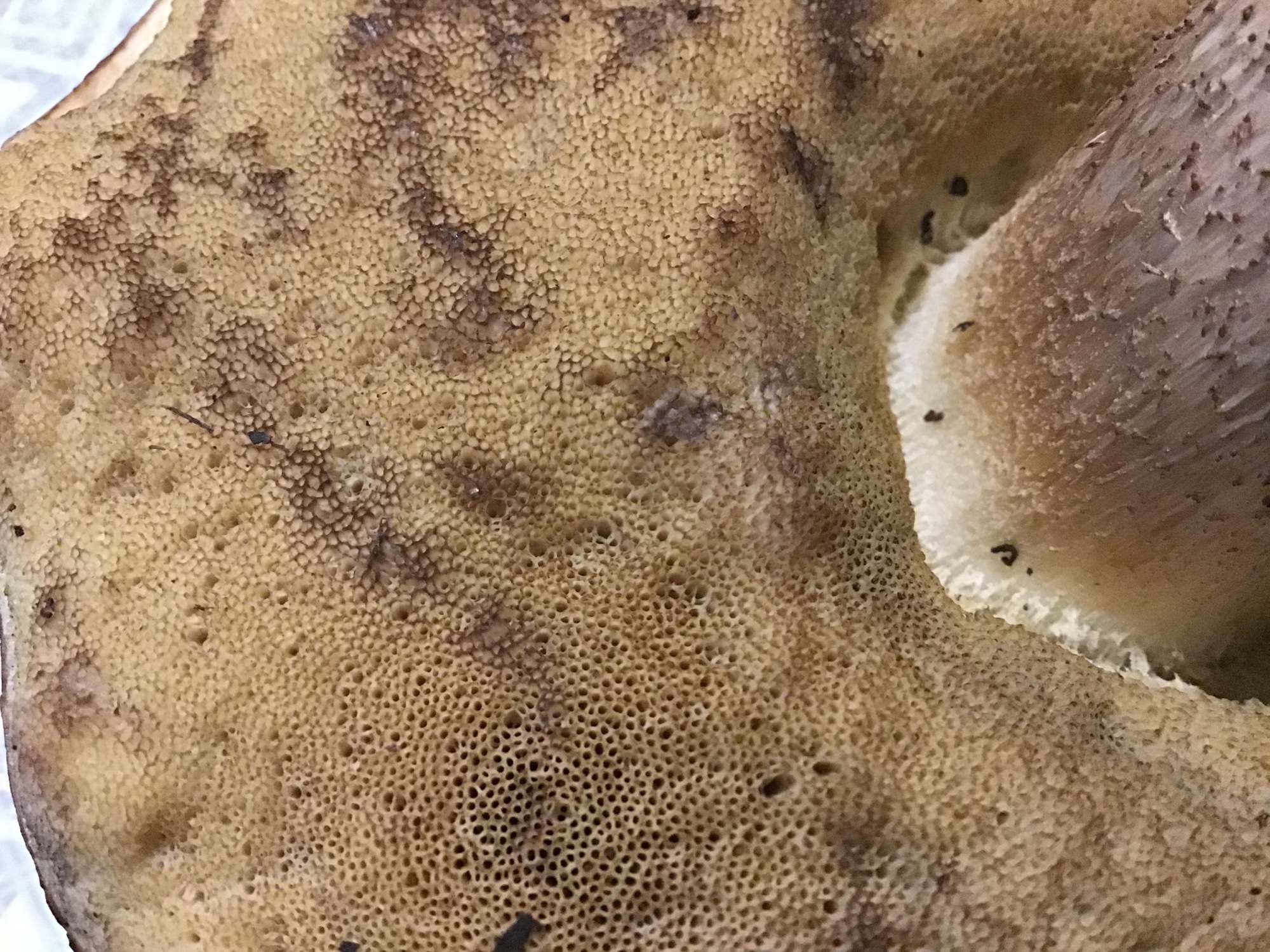 Donc voici mon candidat le plus proche, Leccinum nigellum, mais je ne suis pas convaincu à 100%, ils disent dans les commentaires, chair virant au violé ardoisé à la coupe, plutôt gris ardoisé dans mon cas, et les pores crème sont plutôt jaunâtre mais le spécimen que j'ai semble assez vieux.