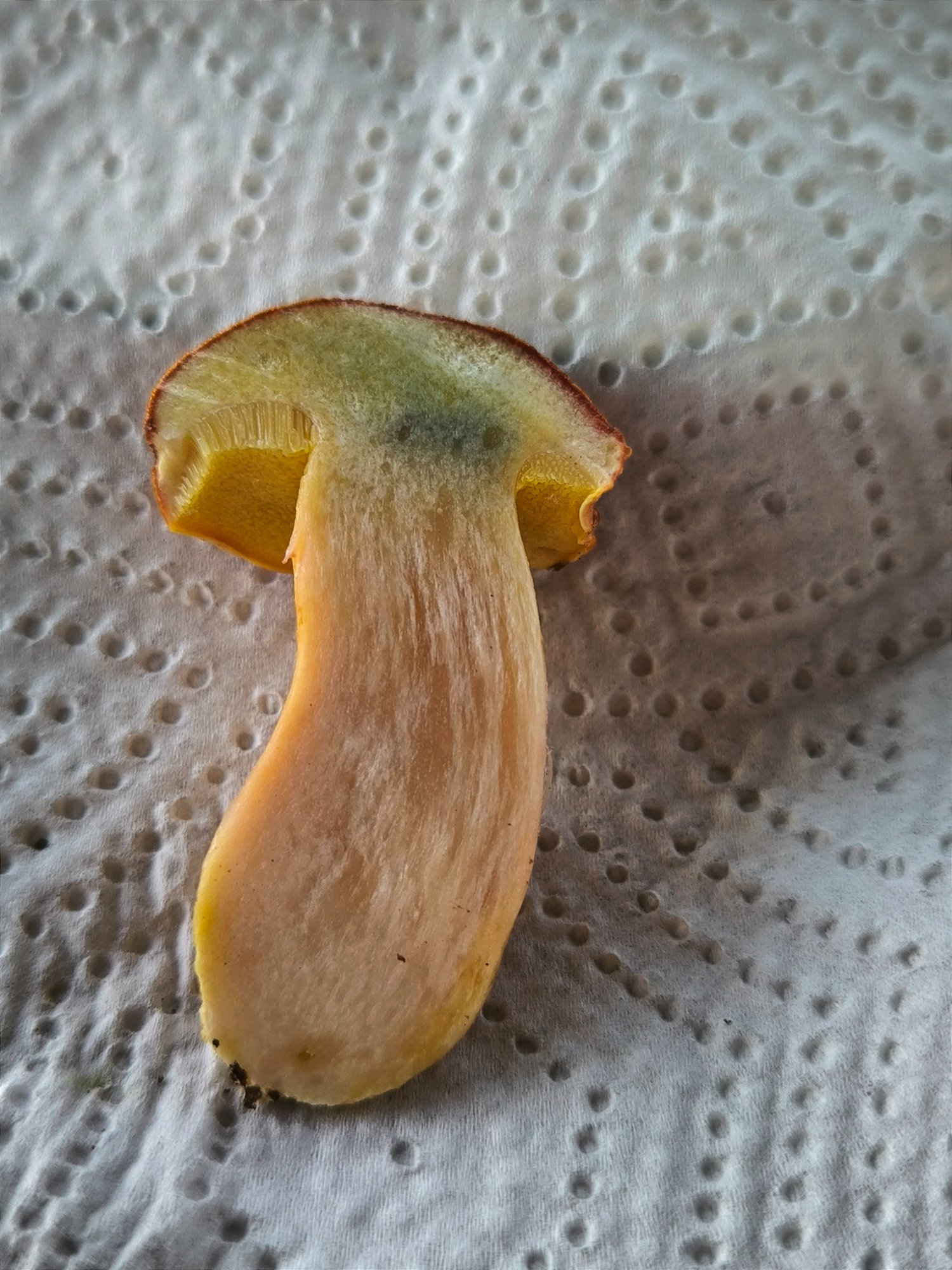 (La chair paraît plus pâle à la droite du chapeau, c'est que j'avais fait une première coupe une heure plus tôt... Ça a un peu séché)