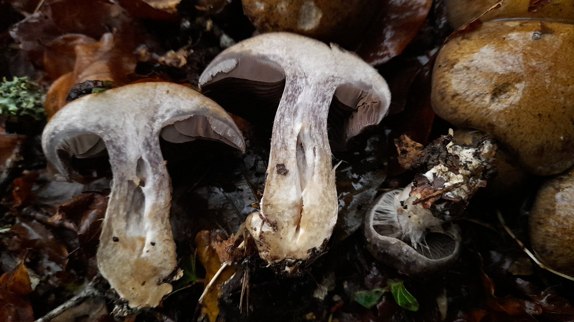 Chapeau très visqueux (gluant) (6 cm) pousse en groupe, sous Fagus, pied sec (6cm) chair blanche avec des zones violacées vers le haut et ocre à la base, odeur qui me rappelle un peu Camphoratus?
