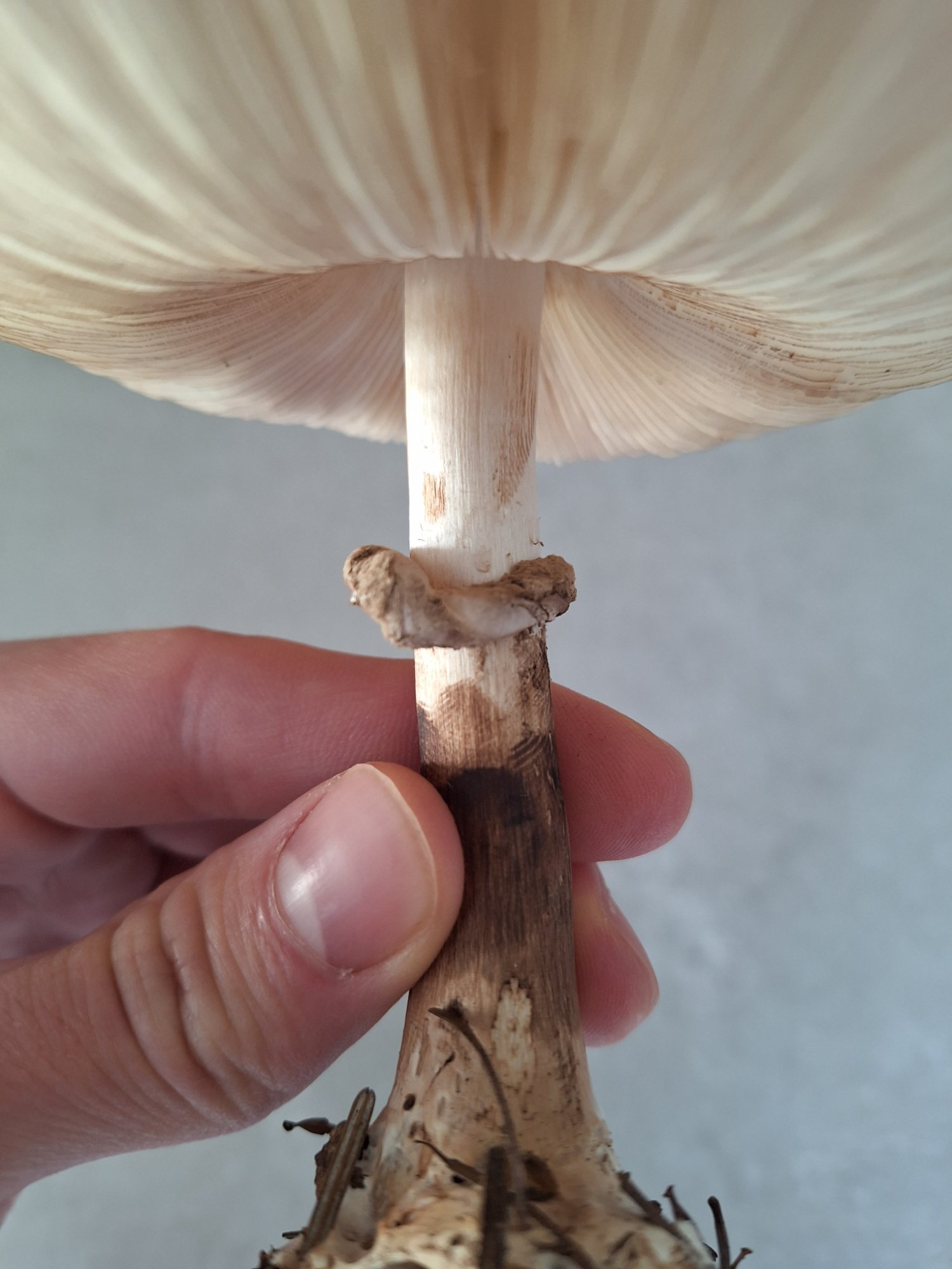 Son pied bulbeux mesure plus de 10cm et présente un anneau (que je n'ai pas su faire coulisser, peut être un manque d'adresse de ma part) et est blanc ou crème au dessus de l'anneau et plutôt brun en dessous.