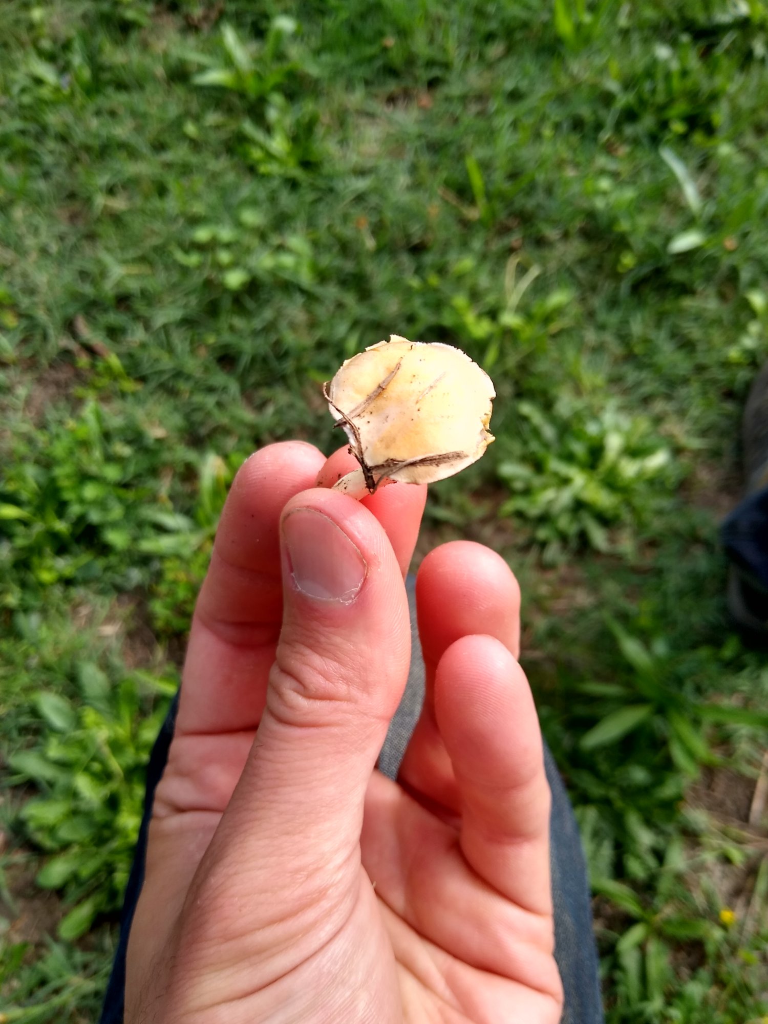Chapeau : entre 3 ou 4 cm de diamètre, un peu sec, jaune pâle, il me semble voir des restes de voile sur sa marge.