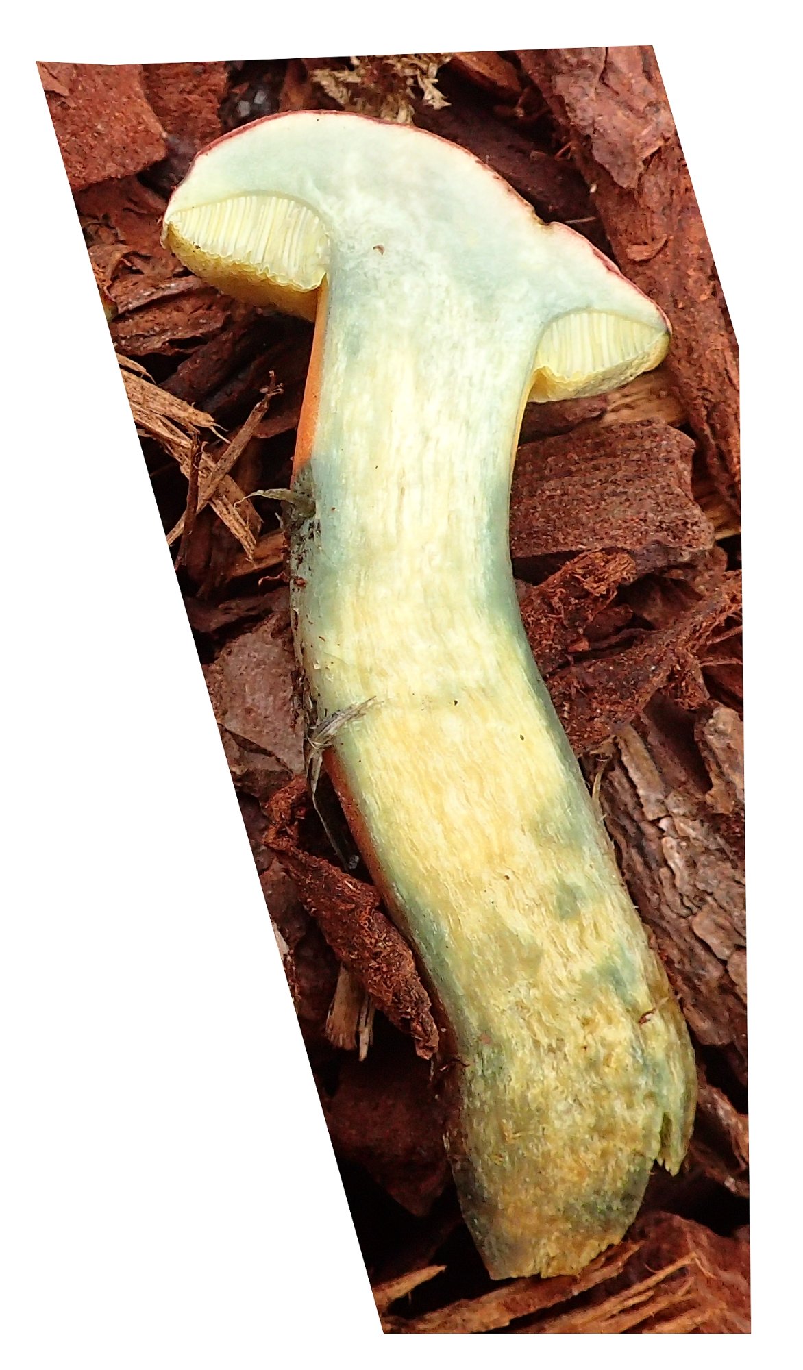 En la matière, ma religion n'est pas faite et je n'ai jamais croisé X. a.. Toutefois, j'observe que la base du pied n'est pas complète, que les ponctuations sont parfois très difficiles à trouver, que la chair n'est guère jaune orangé dans la base et que le bleuissement du pied paraît presque trop intense pour R. a. Toutefois, c'est une fois encore une espèce que je n'ai jamais rencontrée, donc je ne saurais être catégorique.