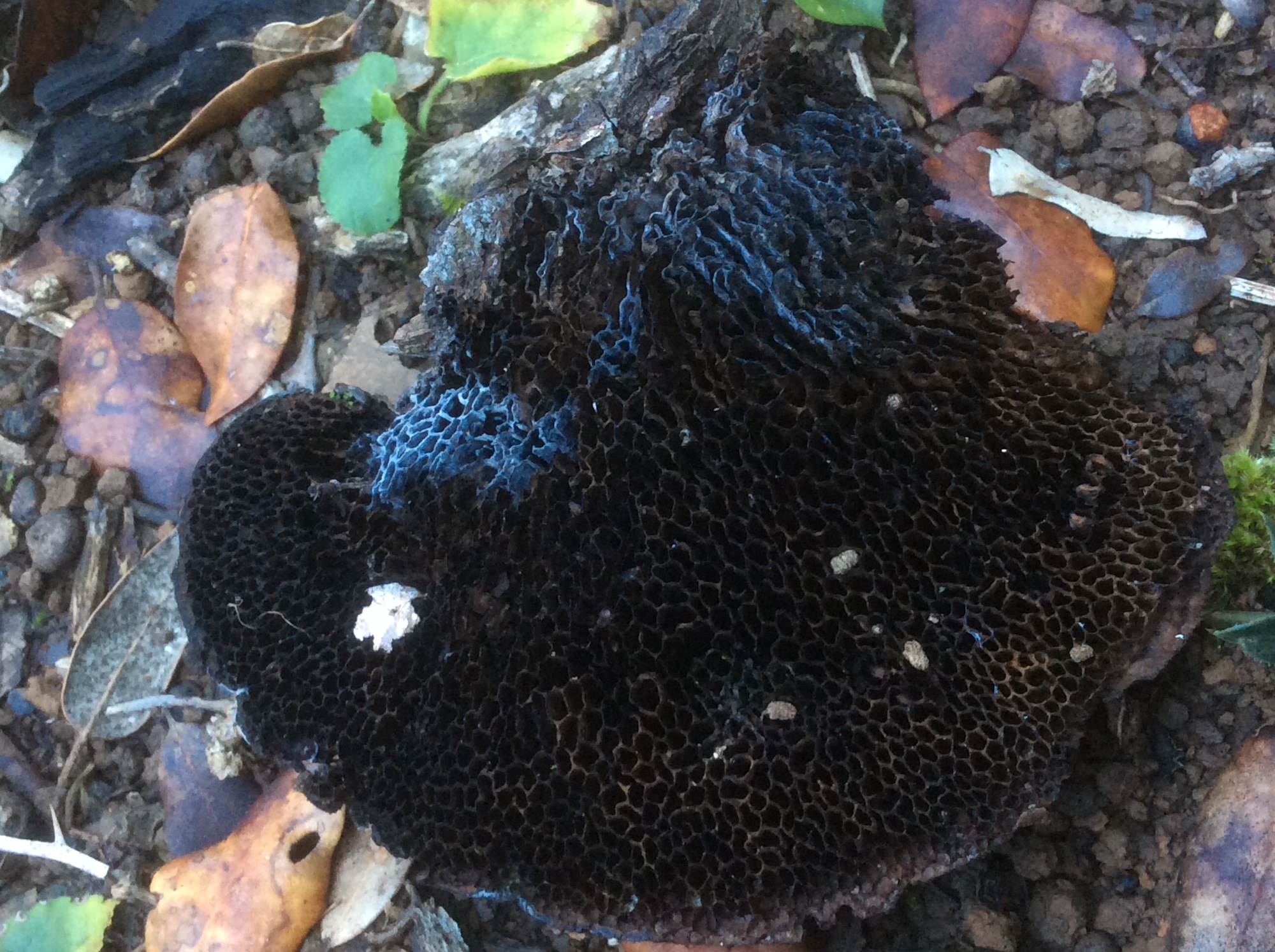 C'est vraiment dommage d'enterrer ce genre de demandes. Tout de même, un champignon bleu, il n'y en a pas non plus des centaines. Et qui colonise un polypore comme Daedaleopsis nitida, ça ne doit pas non plus courir les rues. Apparemment ce n'est pas poré, tu confirmes ? Tu as envisagé un myxo ?