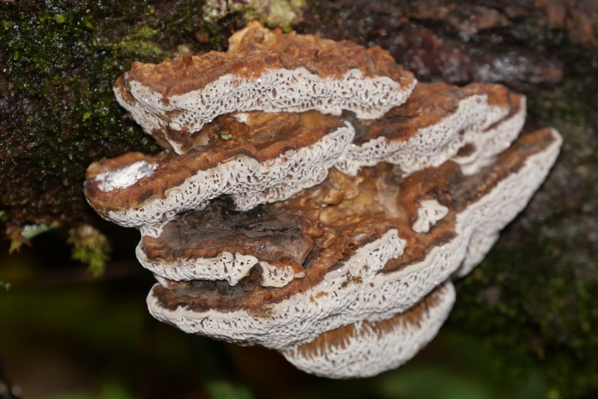 J'ai trouvé ces champignons hier sur un arbre tombé (Salix cinerea je crois). Ils étaient très mouillés par la pluie. J'estime la taille des chapeaux à environ 5-8 cm. C'est une Polyporaceae je suppose. Y a-t-il autre chose à dire ? Je suis désolée, je n'ai pas noté beaucoup de données (il a commencé à pleuvoir très fort... :-)