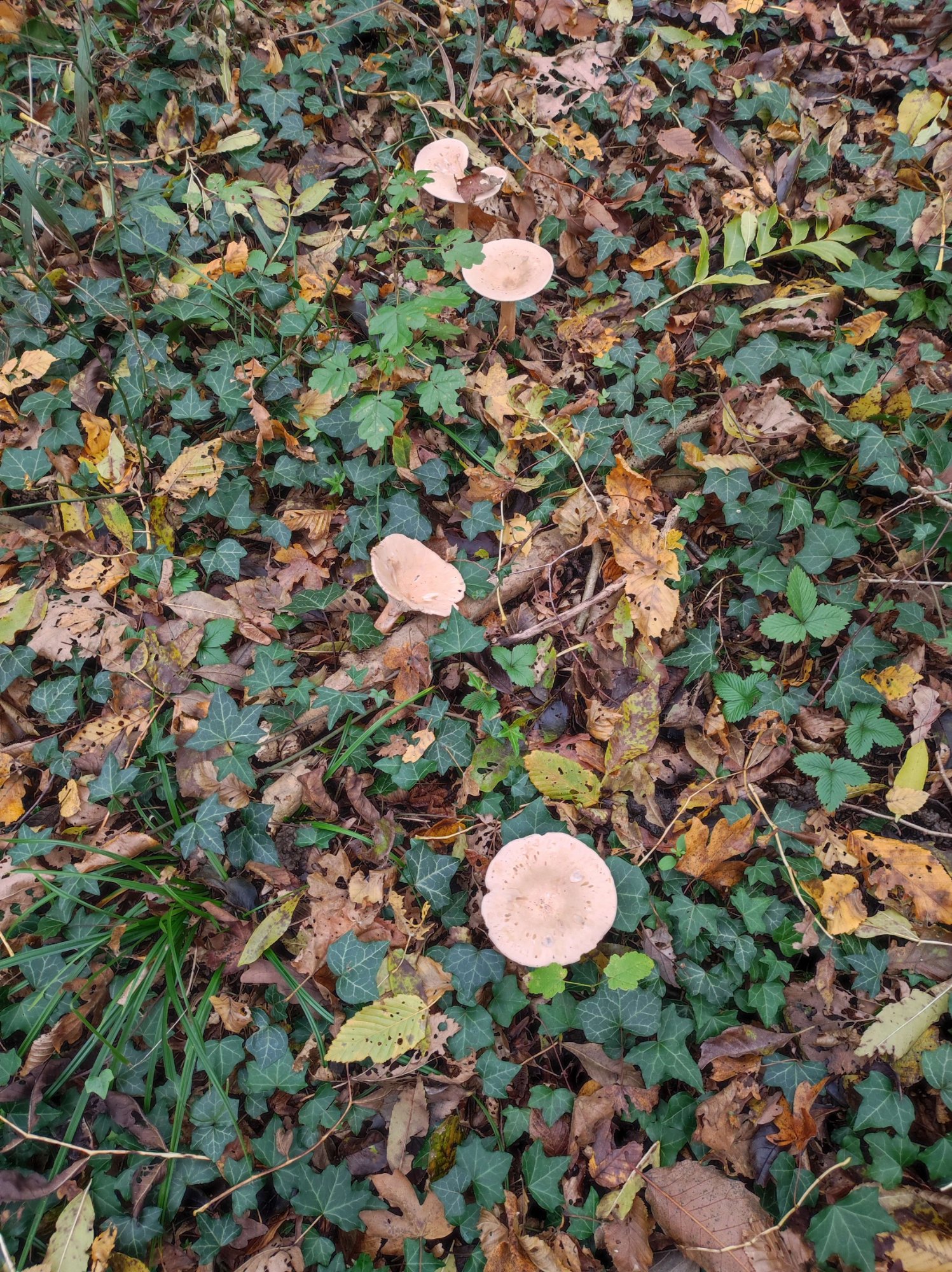 Le champignon poussait individuellement dans une rangée de plusieurs individus plutôt espacés entre eux. Le sol était recouvert de feuilles mortes et de lierre, et les champignons semblaient pousser près d'un arbre feuillu. La forêt était constitué uniquement de feuillus.