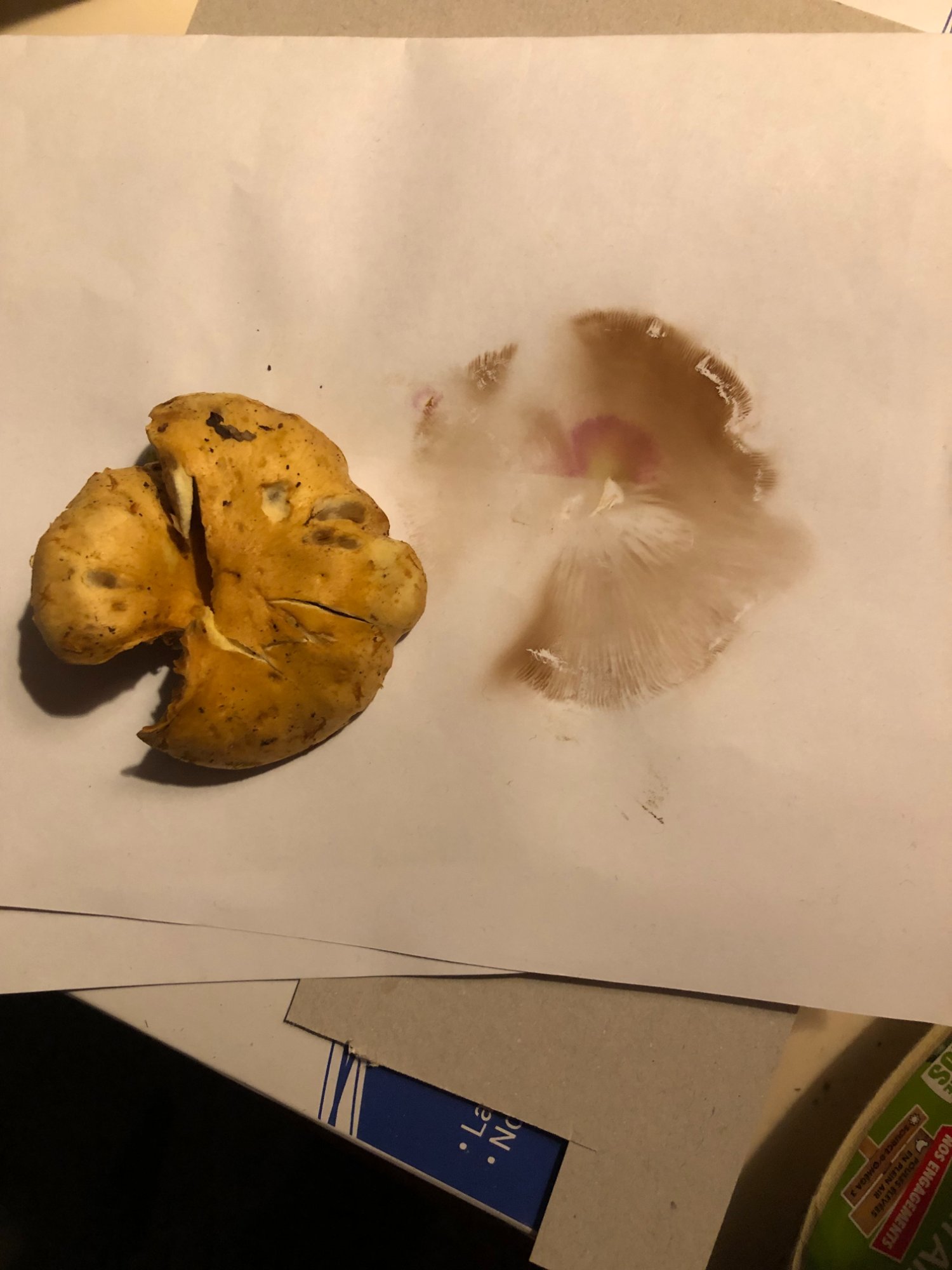 J'ai éliminé pas mal de candidats jaunes, et j'arrive à cette espèce mais il n'y avait que 2 champi déjà un peu vieillots alors peut-être que l'identification n'aboutira pas. A voir