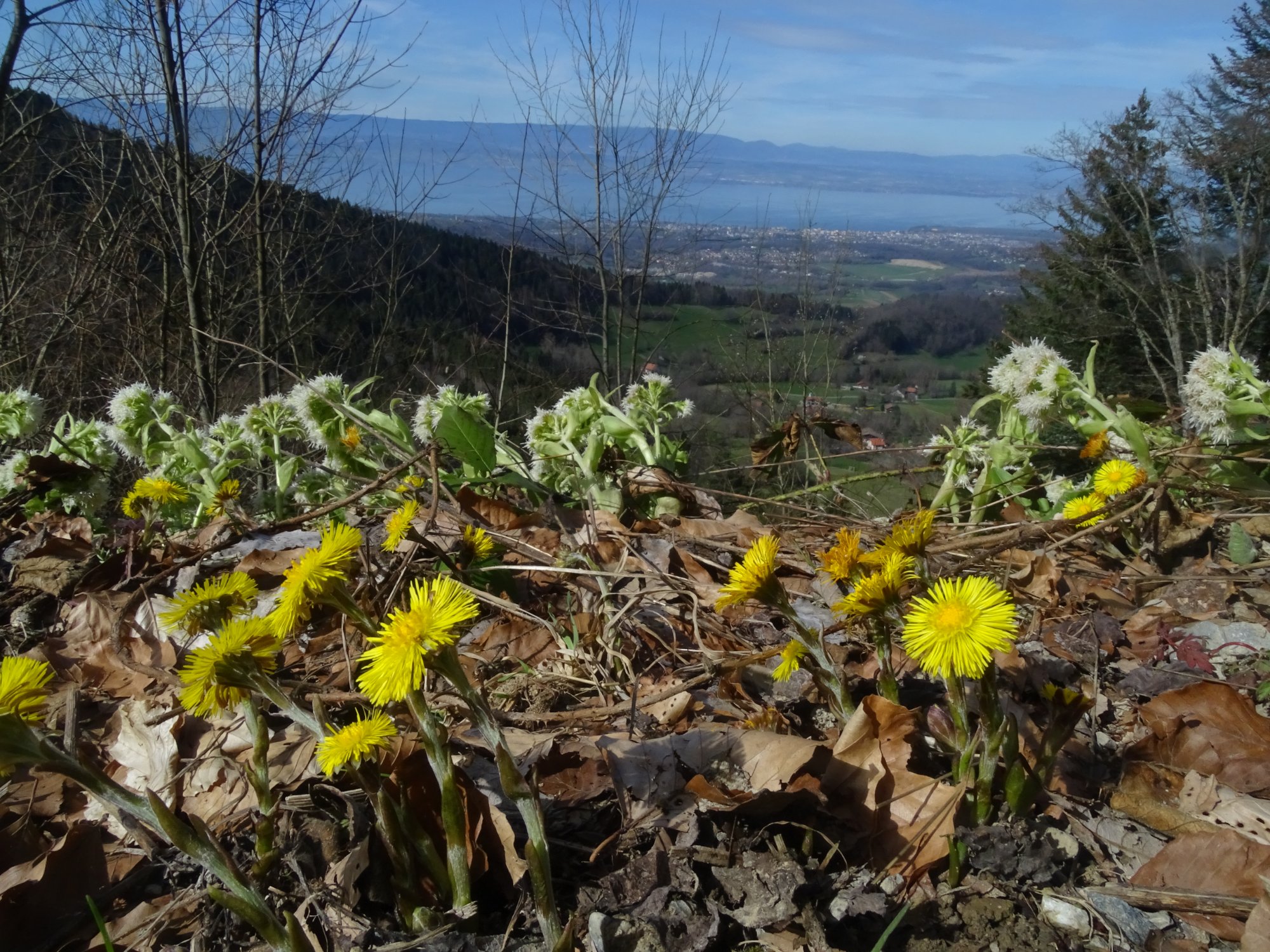 Il s'agit en effet de Tussilago farfara pour l'astéracée jaune et de Petasites albus pour la fleur en arrière plan. Les premières printanières de montagne !