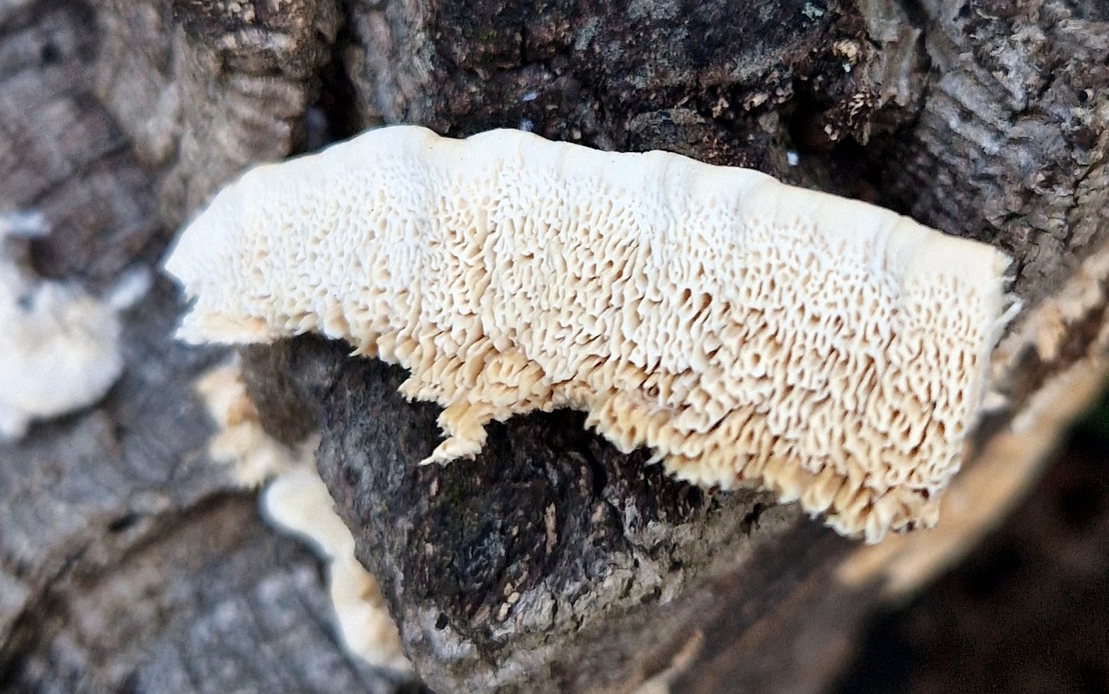 En légendant mes photos du mois dernier, je tombe sur ce polypore étalé-réfléchi sur lequel je ne sais pas mettre un nom, il vous évoque quelque chose ? Palombaggia le 16/03/24, en bord de route sur un tronçon de chêne-liège laissé au sol, couvert (le tronçon) par ailleurs de nombreux Trichaptum biforme avec aussi quelques Pleurotus pulmonarius. Le polypore est étalé sur l'écorce (liège) et sur la tranche (aubier) mais surtout développé "en dentelle" le long du cambium. Comme on voit, pores assez larges, irréguliers, anguleux, allongés, quasi-irpicoïdes. Rien mesuré, rien rapporté, on allait juste à la plage, photos au smartphone :