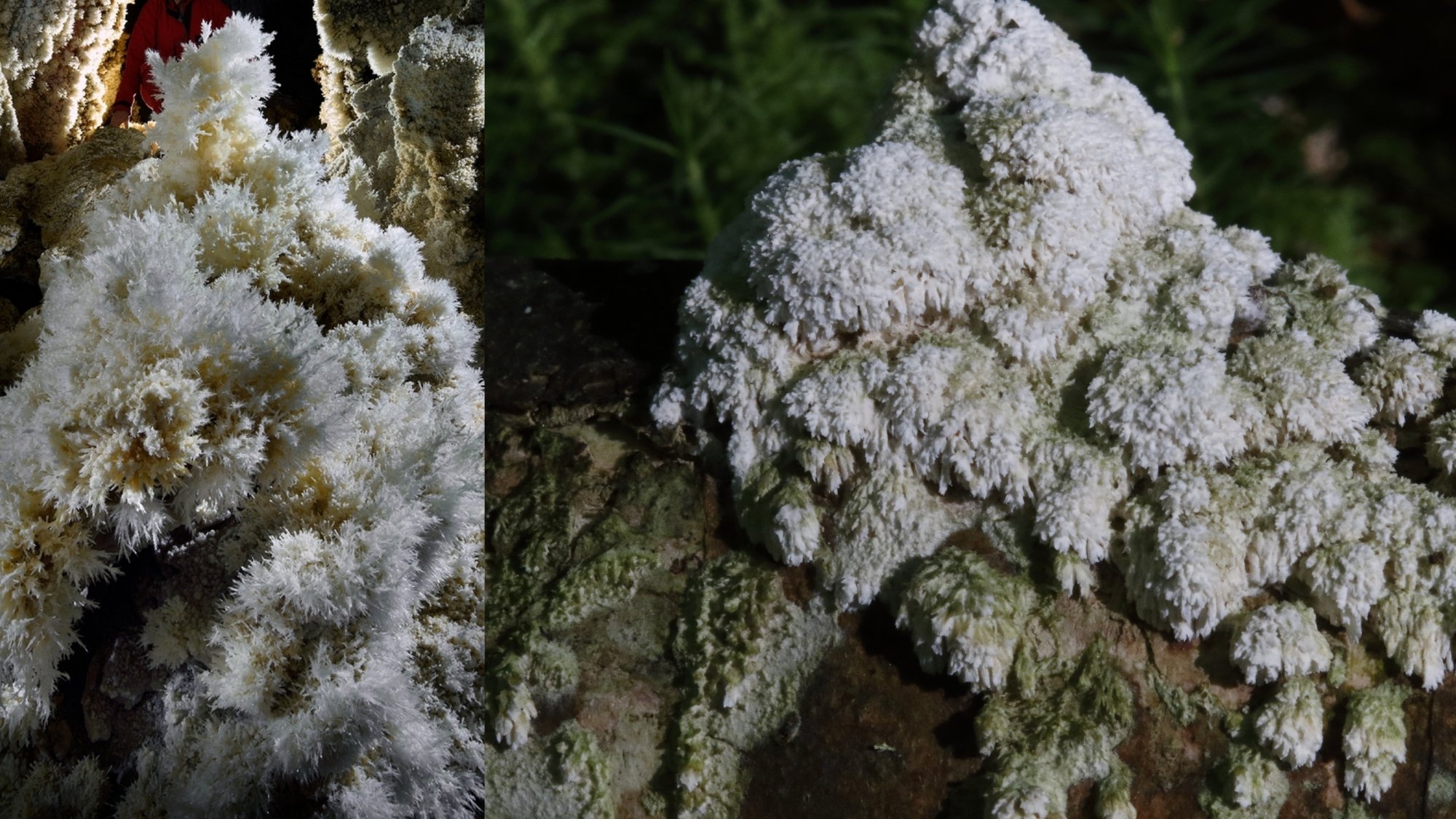 oui à vos questions. C'est une espèce que j'ai trouvée en grand nombre à la face infère des branches de Charme tombées au sol bien que donnée comme rare par Mycodb. J'aime à comparer l'aspect des fructifications à des fleurs d'aragonite, magnifiques concrétions minérales du milieu souterrain.