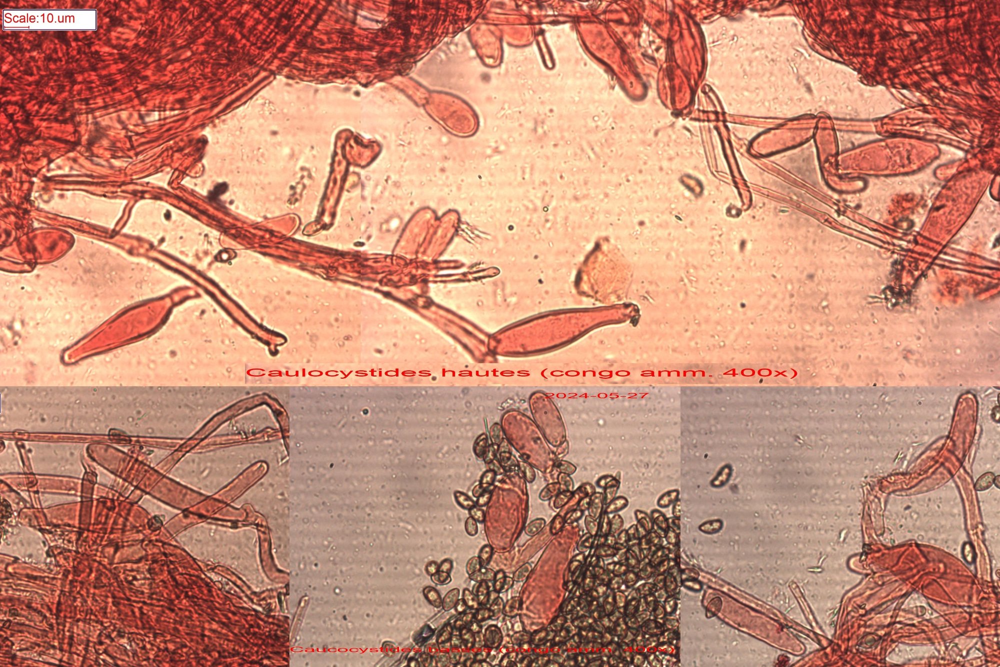 Caulocystides présentes et abondantes en haut du pied, plus clairsemées en bas, nettement moins larges.