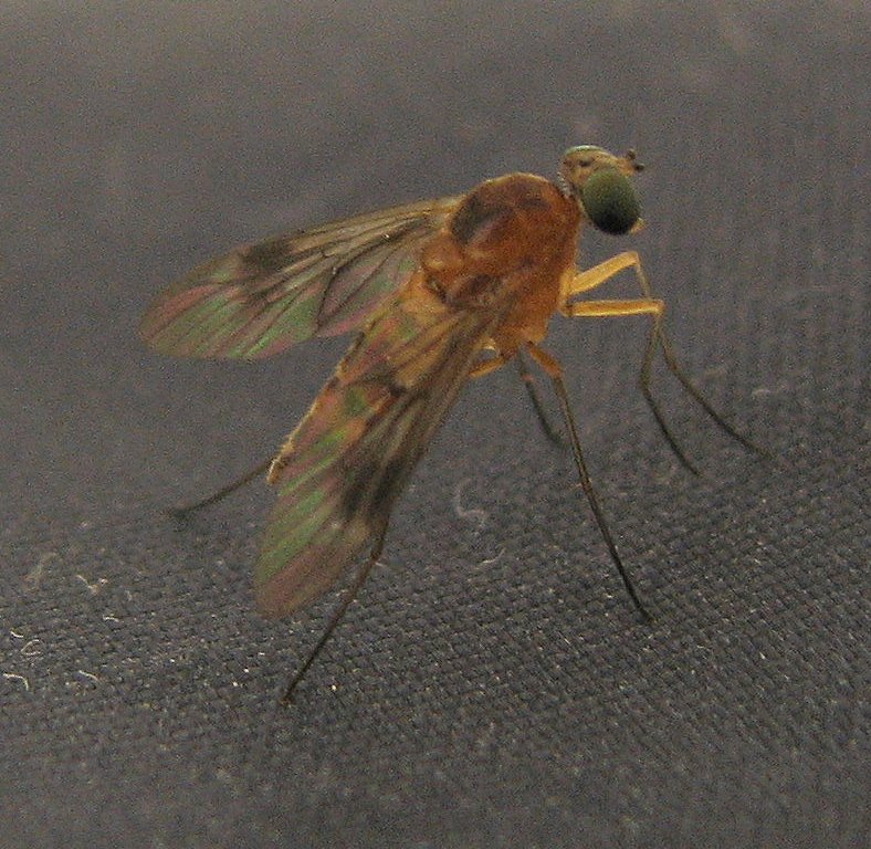 4.b. Abdomen yellow brown, thoracic dorsum and sides darkened; antenna: 3rd antennal segment wider than the 2nd. 6-8 mm. -> Chrysopilus luteolus
