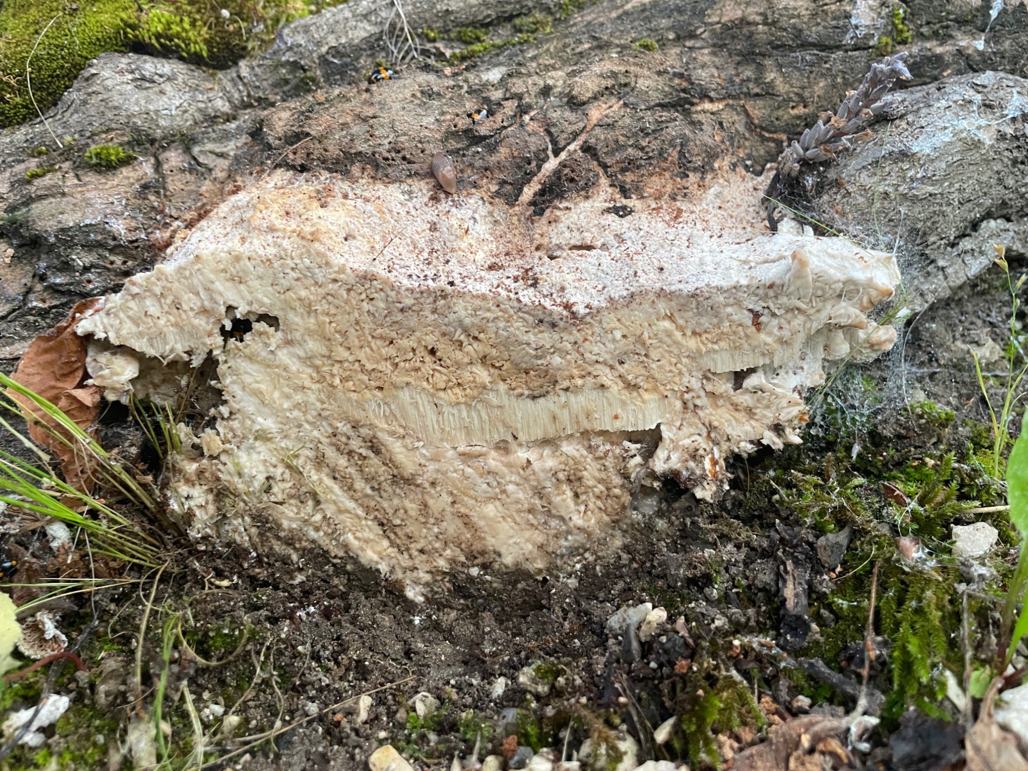 Pour en revenir à l'identification du polypore, j'avais pensé à R. ulmarius du fait du chapeau blanchâtre mais P. fraxinea irait aussi. Pas évident parce que le polypore lui-même est dégradé. La chair semble virer au brun mais c'est un peu le cas des deux espèces. Un coup de potasse départagerait.