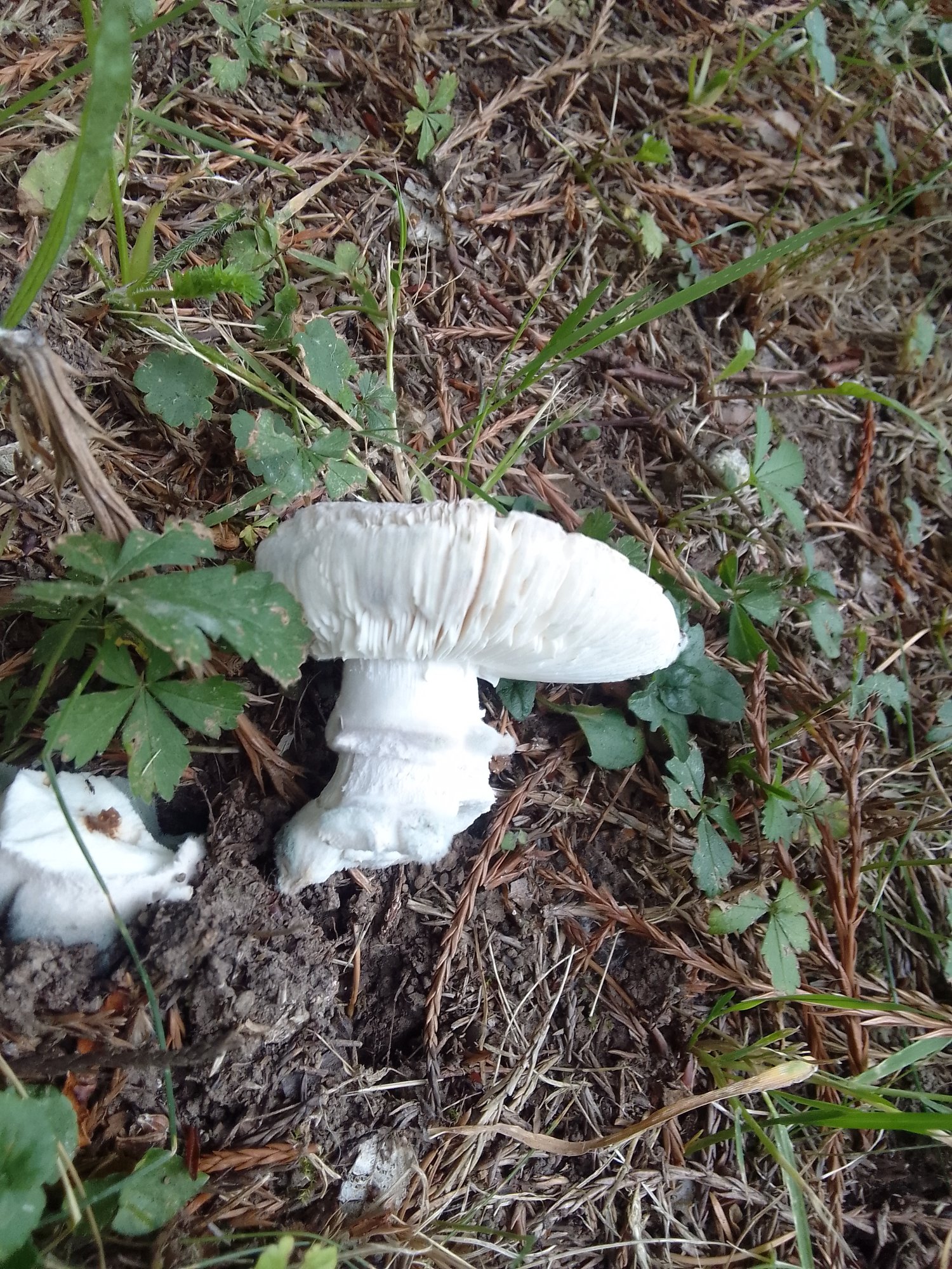 Lames crèmes et pied vraisemblablement radicant et bulbeux. Verrues du chapeau assez larges, floconneuses. Chapeau devenu plat et parasité sur le vieux. Taille 7 a 8 cm de diametre.