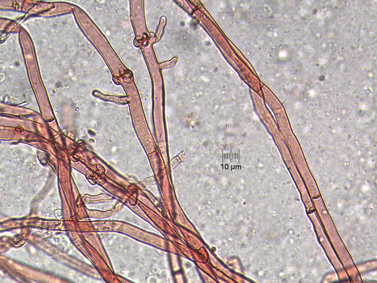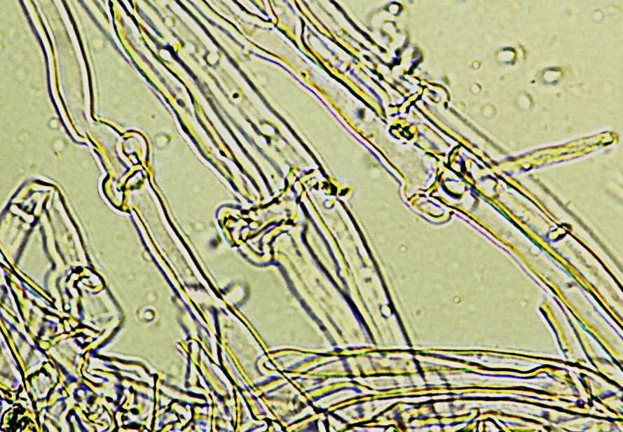 Difficile à dire sur ces clichés cadrés serré. Les hyphes squelettiques sont à septation simple - c'est le cas sur certaines ici - et peu tortueuses avec une certaine longueur et une paroi souvent épaisse. Les hyphes autres que génératrices sont à rechercher surtout dans la trame.