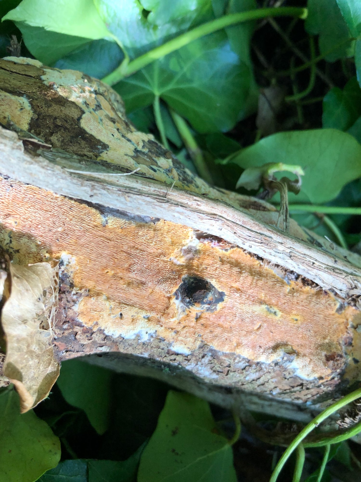 En compléments : cette tache est d'environ 30 x 8 cm. La seule véritable coupure est la branche de lierre c'est pourquoi je pense qu'elle est à l'origine, Le orange me parait moins vif aujourd'hui (le temps et la branche sont moins humides). Je n'avais pas remarqué ces points rouges il y a quelques jours.
