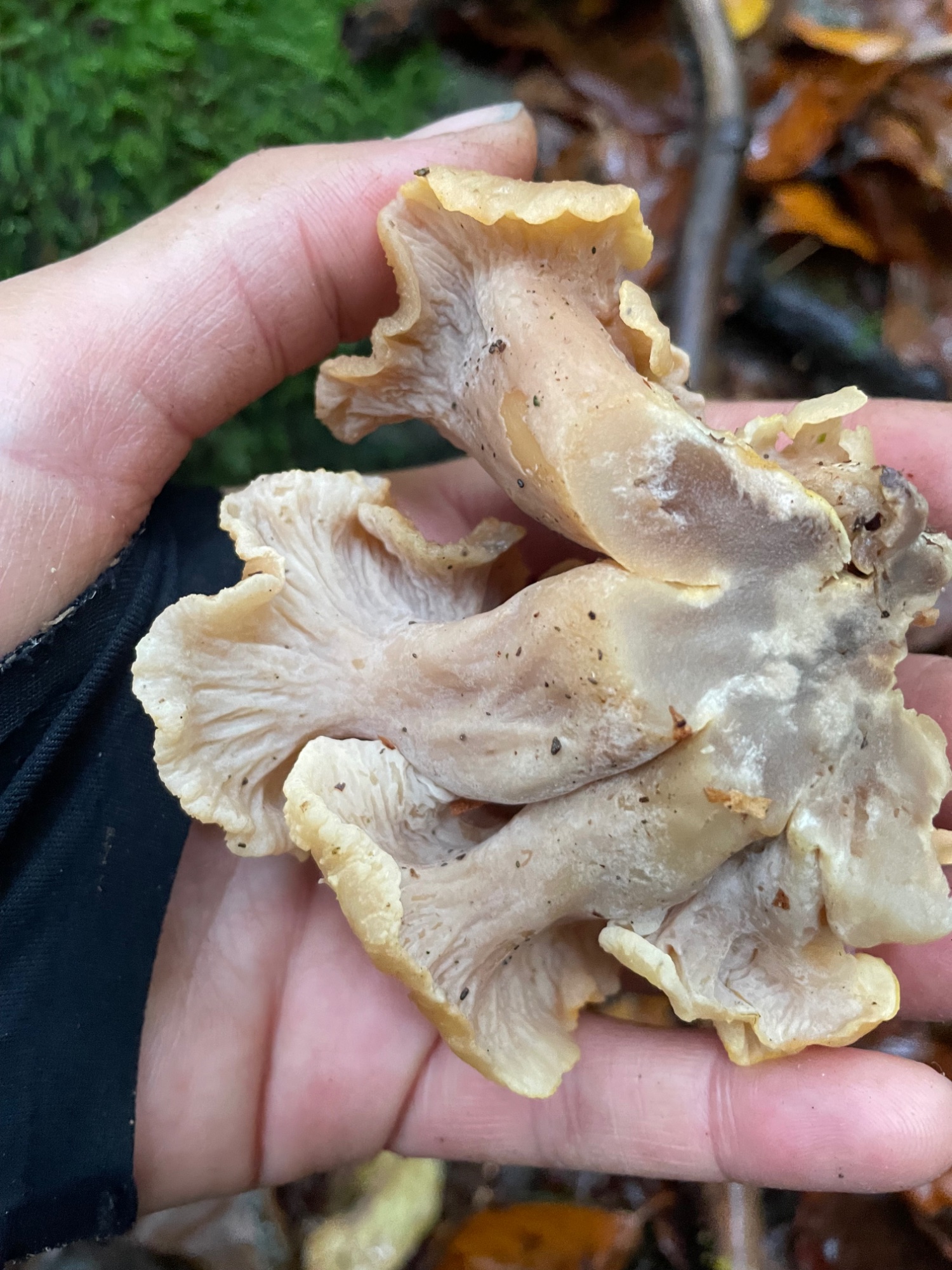 Hier, dans une forêt de feuillus, conifères. Je suis tombée sur cette espèce de craterellus mais je me demande ce que c’est. Elles poussaient en touffe, elles ont des plis sous le chapeau, sont jaunes très pâle avec des reflets violet rose. Les plis continuent sur le pied pour certain et pas sur d’autres. Ils sont parfois peu marqués.