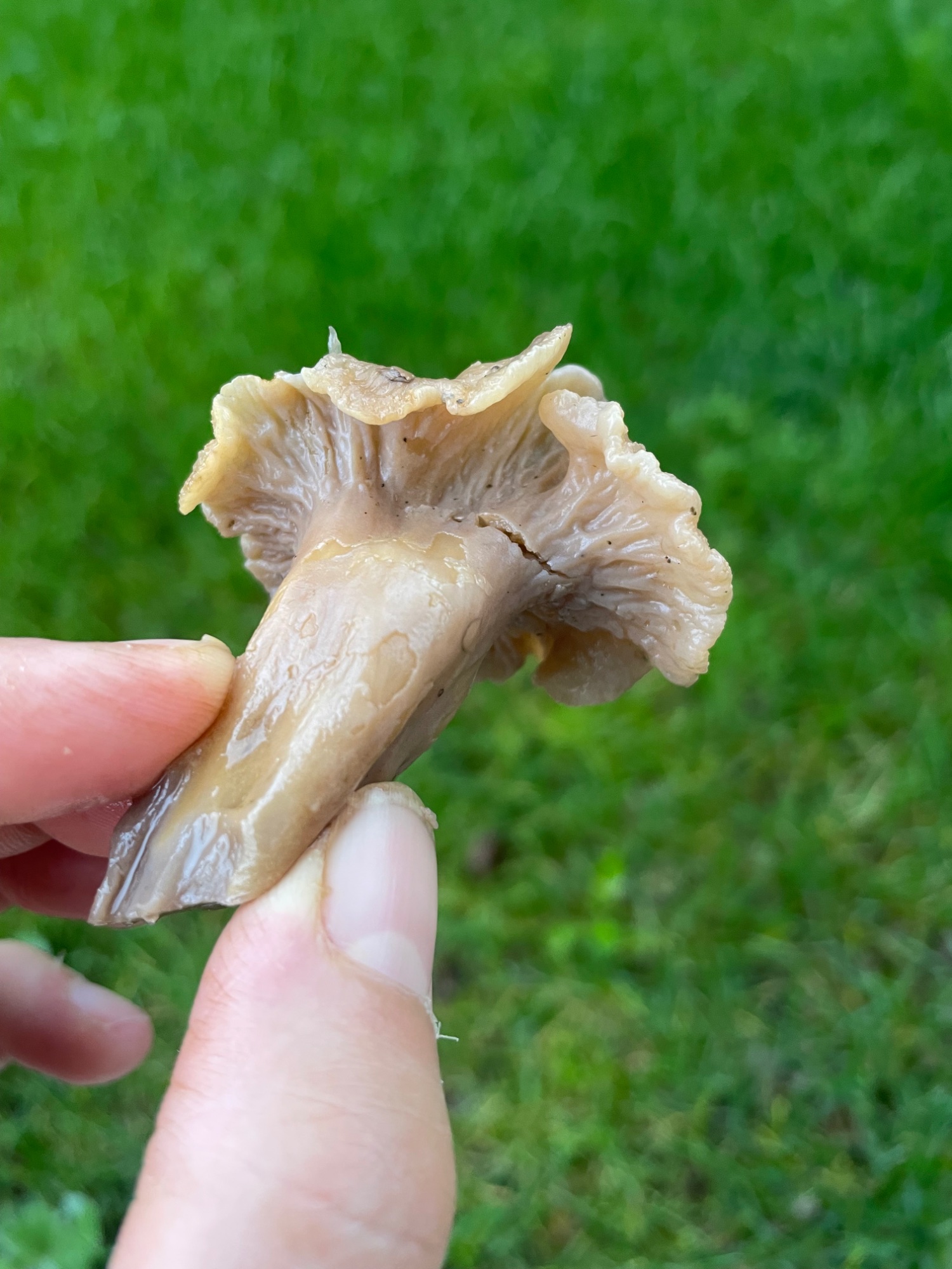 Hier, dans une forêt de feuillus, conifères. Je suis tombée sur cette espèce de craterellus mais je me demande ce que c’est. Elles poussaient en touffe, elles ont des plis sous le chapeau, sont jaunes très pâle avec des reflets violet rose. Les plis continuent sur le pied pour certain et pas sur d’autres. Ils sont parfois peu marqués.