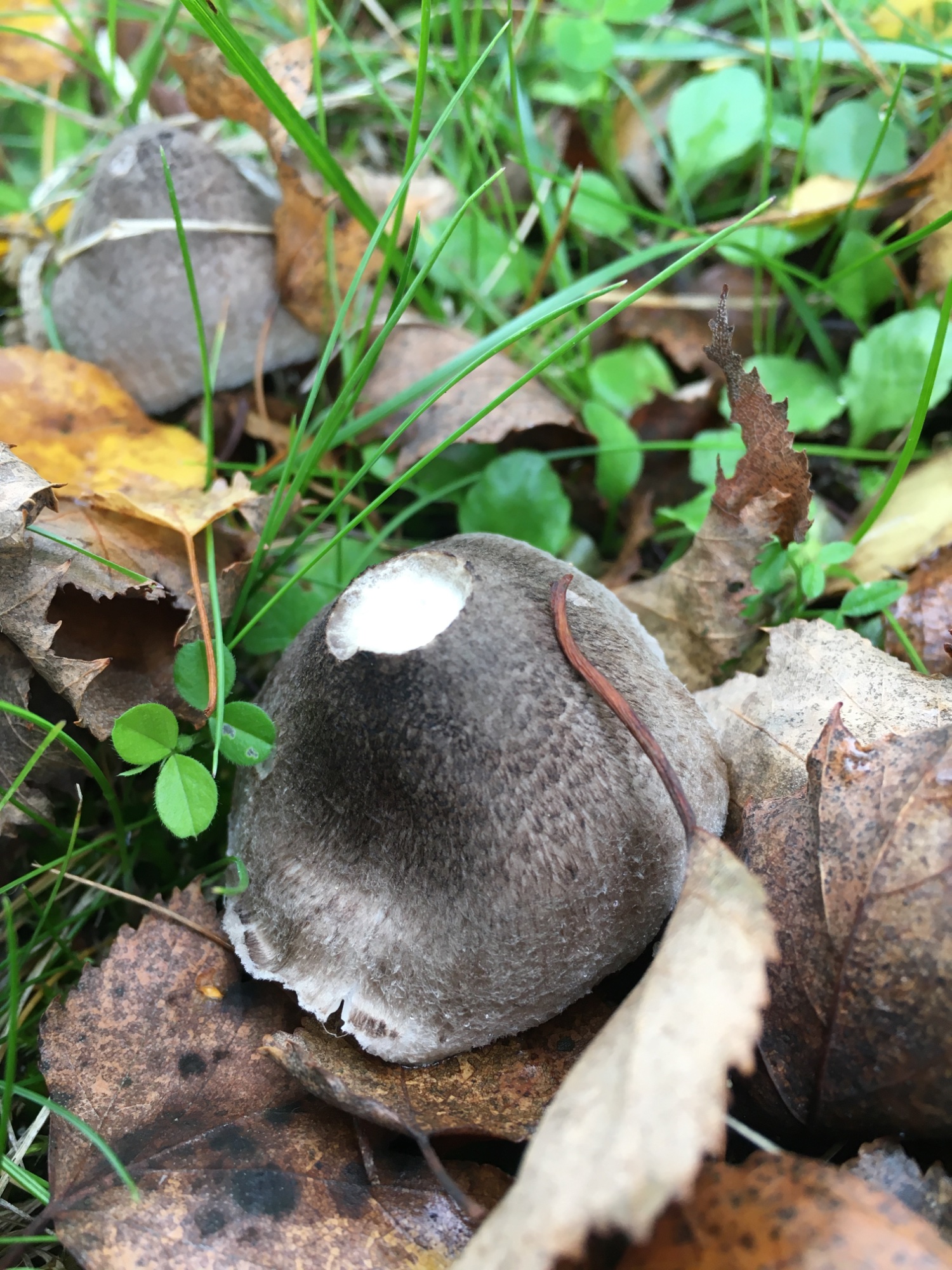 Je remonte ce sujet. Il est possible qu'il y ait deux espèces comme le suggère Fouad mais nous nous occupons de celui qui est "gris brun foncé" (introduction et deux premières photos). Le dernier montré (18/10, 20h08) était-il aussi gris foncé ? Si oui, ça ne peut-être pour moi T. inocybeoides dont le chapeau est gris pâle.