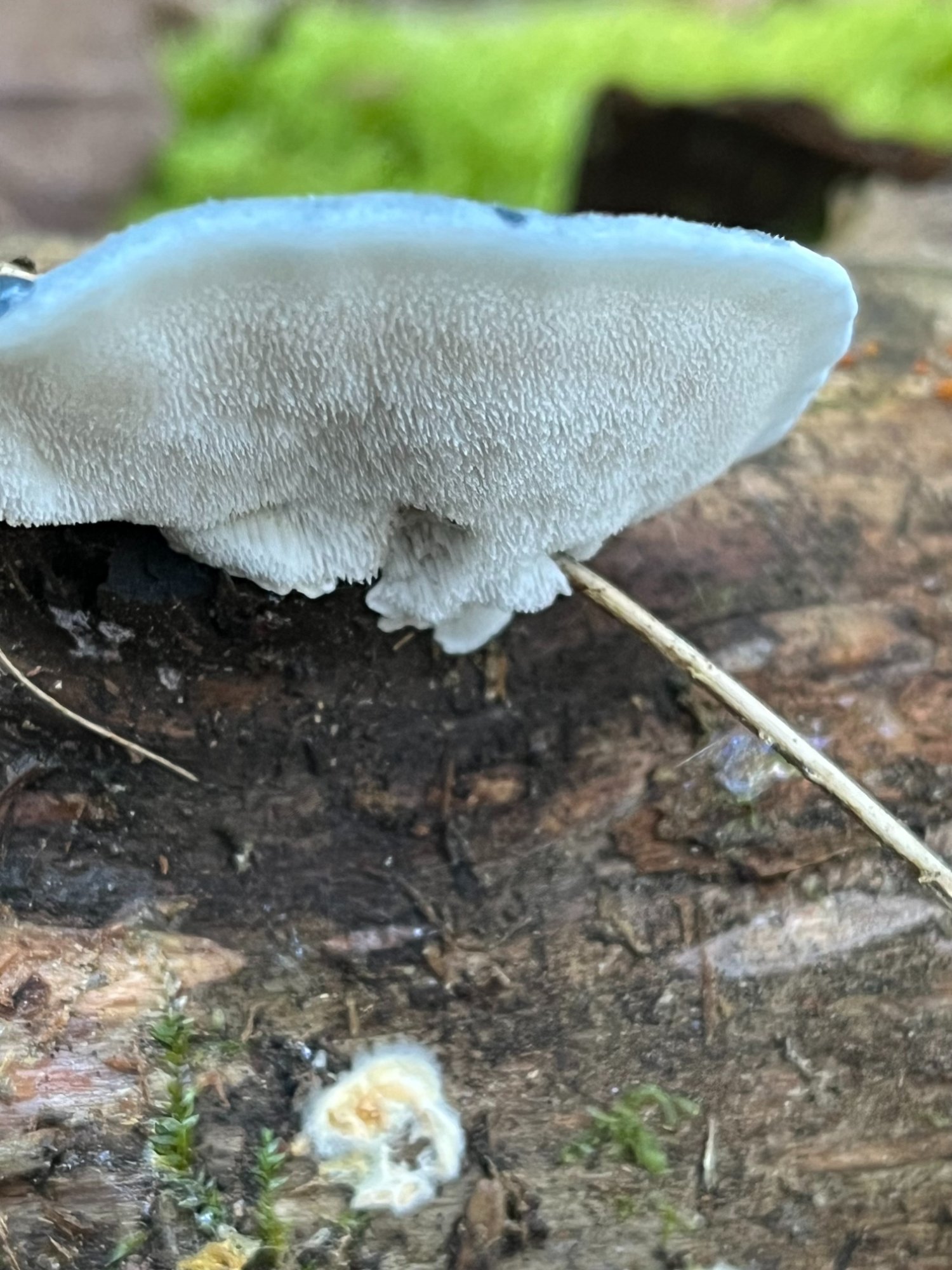 Chapeau environ 4 x 3 cm, non visqueux, plutôt doux au toucher. Aiguillons blancs sur la face inférieure. Chapeau ferme. Bleu turquoise (moins flashy que sur les photos mais quand même inhabituel - La couleur m'a fait penser au bleu des lagons)