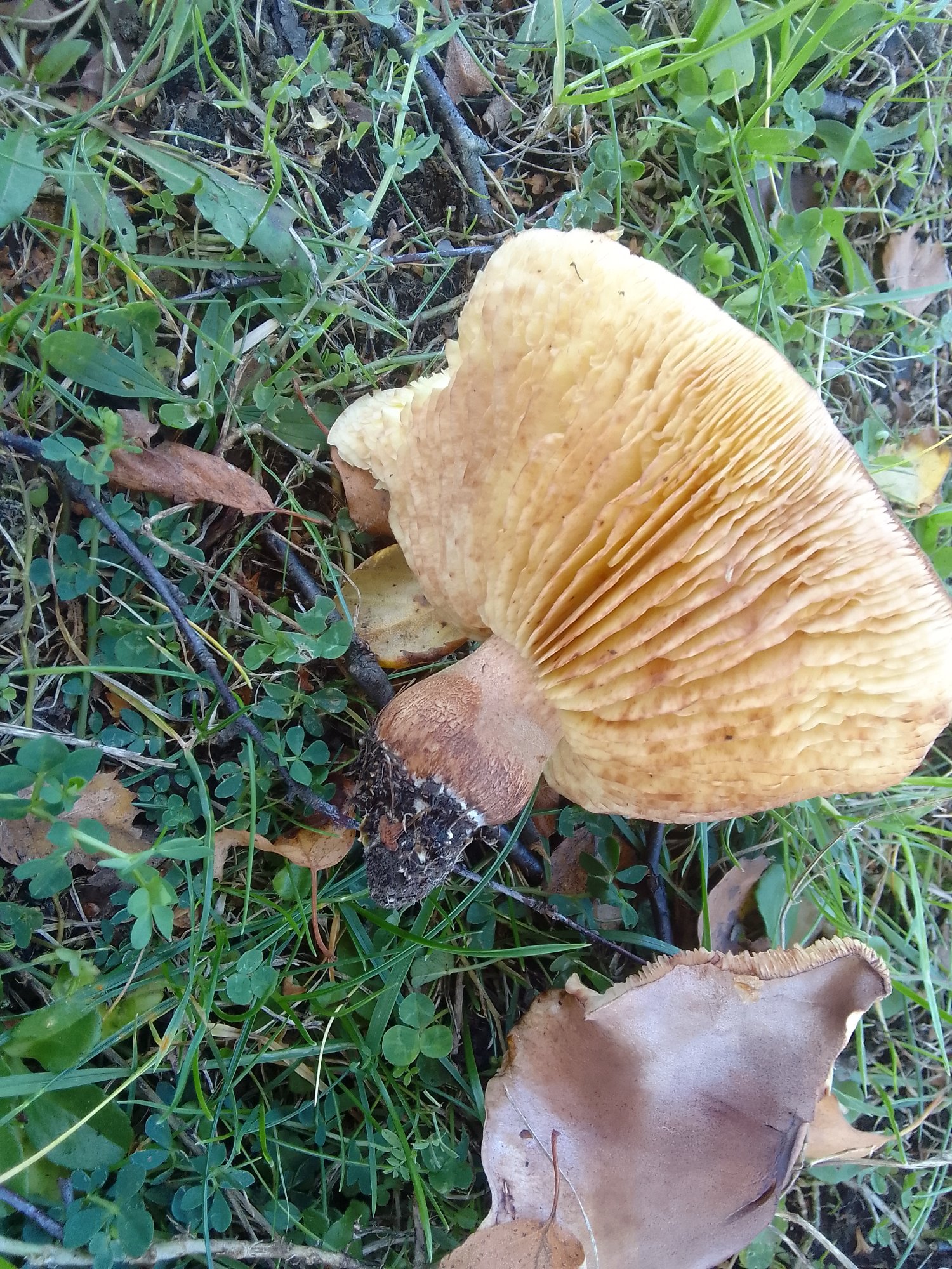 Merci pour vos remarques. Ça me parait bien correspondre. Surtout ce liseré de chair jaune au bord, caractère marquant et un peu inhabituel pour moi. J'ai croisé sur le web quelques planches illustrées avec le pied caverneux. Pour préciser la géographie, comme demandé par Fouad, il était au parc urbain de Lomme au nord de la commune de Lille. Dans la partie d'agrément (pelouses, arbres isolés) du parc. Un étang a 25 m.