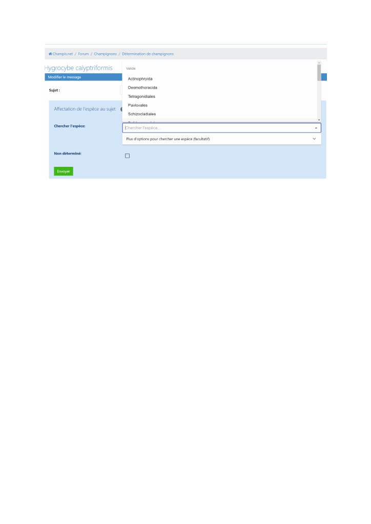28 oct. 2024, 21:50JCB a écrit : Bonsoir,Il suffisait de remplir la case recherche de l'espece avec Hygrocybe calyptriformis