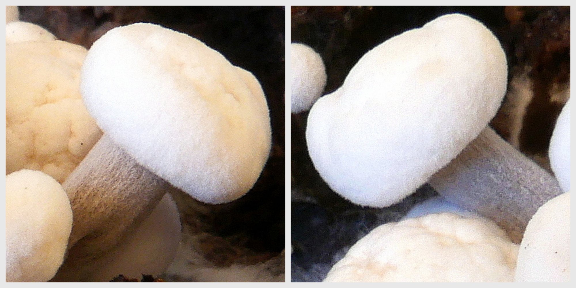 J'étais parti sur de jeunes Asterophora parasitica avec des lames que je me rappelle bien formées et un revêtement blanc à un peu brun et soyeux du chapeau, comme ici ou là. Mais à mieux regarder, de jeunes Asterophora lycoperdoides ne sont pas exclus.