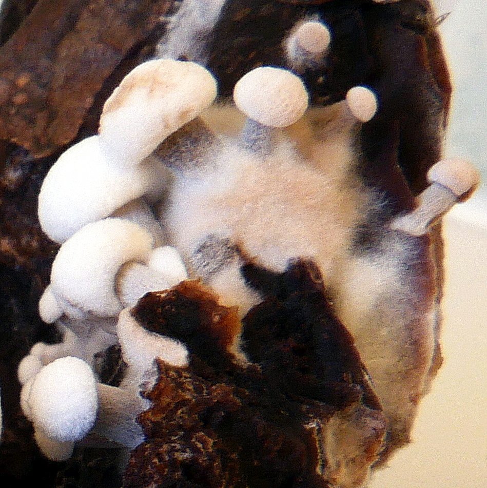 J'étais parti sur de jeunes Asterophora parasitica avec des lames que je me rappelle bien formées et un revêtement blanc à un peu brun et soyeux du chapeau, comme ici ou là. Mais à mieux regarder, de jeunes Asterophora lycoperdoides ne sont pas exclus.