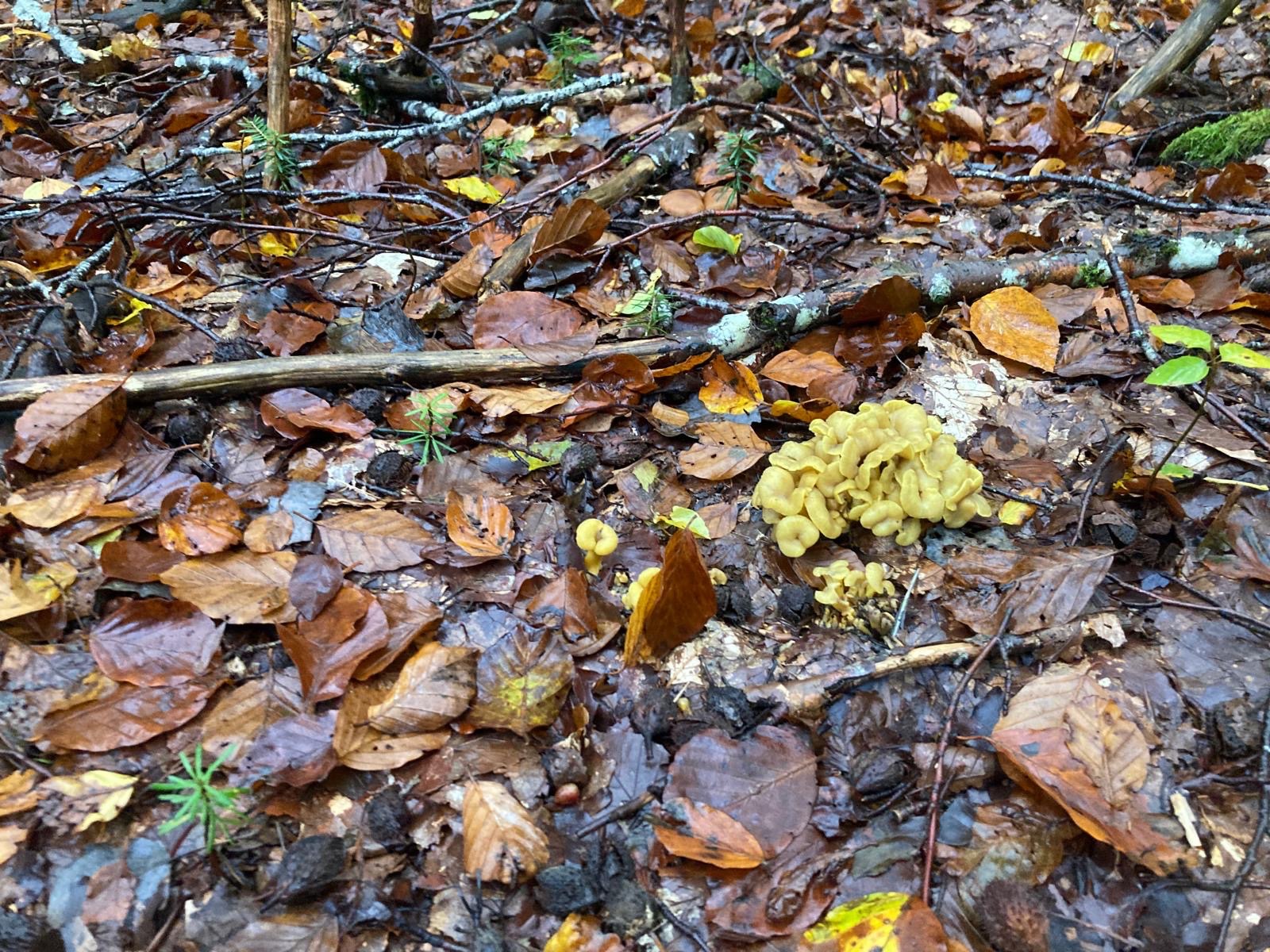 Hier, dans une forêt de feuillus, conifères. Je suis tombée sur cette espèce de craterellus mais je me demande ce que c’est. Elles poussaient en touffe, elles ont des plis sous le chapeau, sont jaunes et elles noircissent au endroit qui sont coupés.