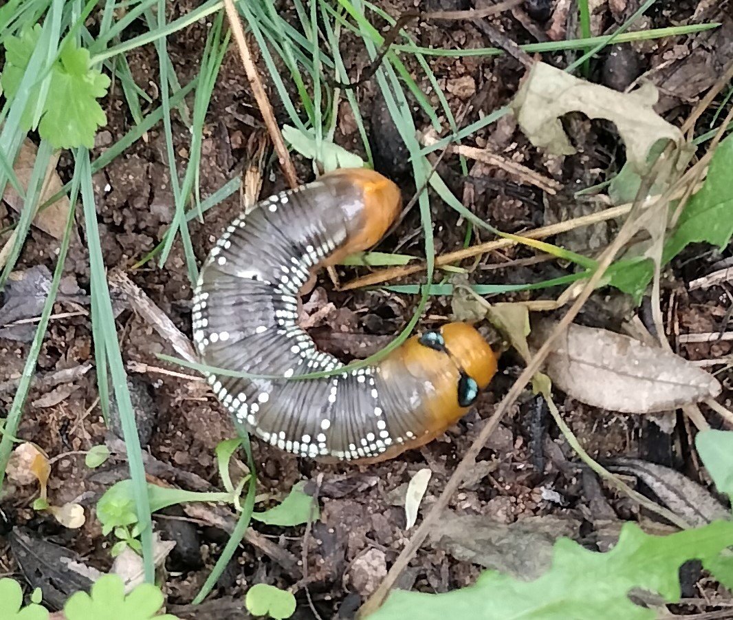 Palombaggia le 10/11/24, au sol, cette chenille peu sympathique, comme une sorte de grosse saucisse molle. Et pourtant le papillon est bien joli, je vous laisse le trouver.