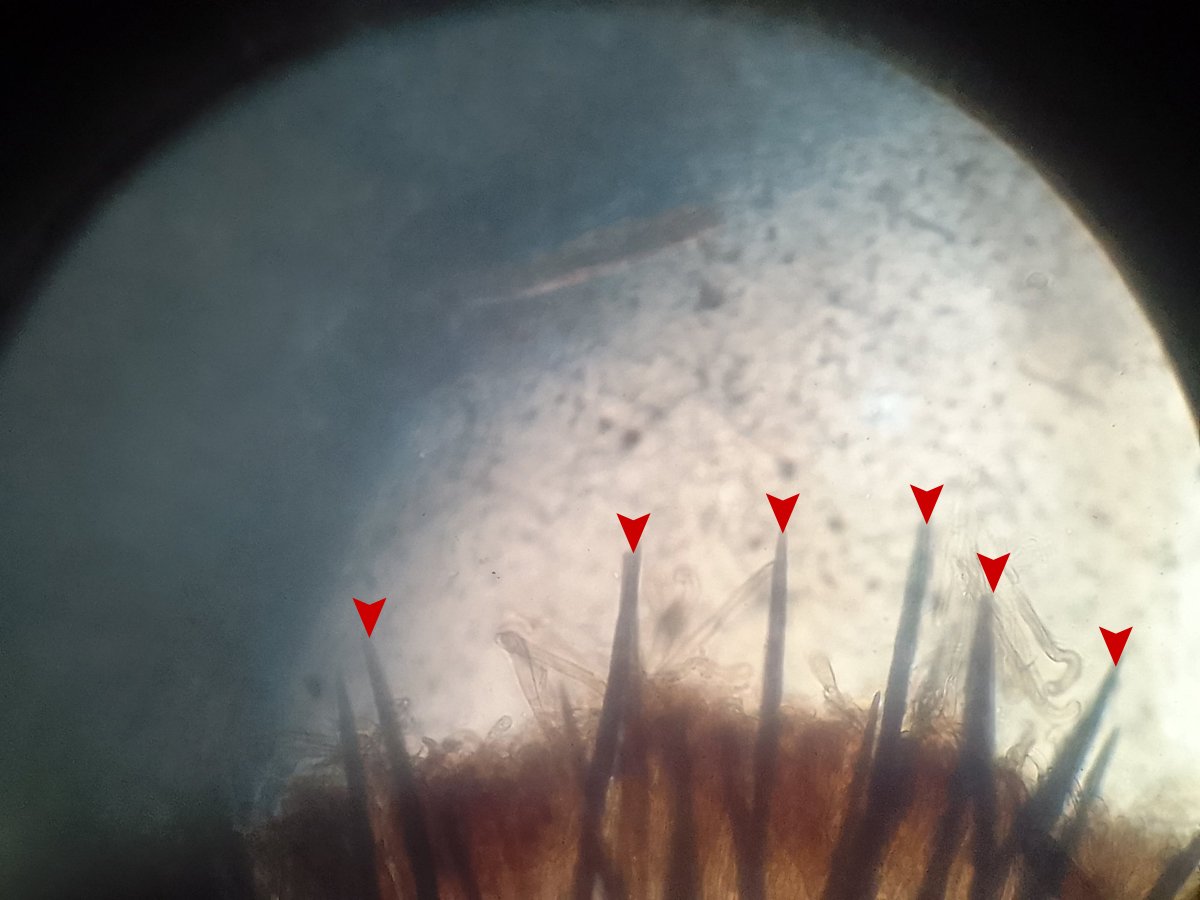 Duche aurait pu observer les poils au niveau du pied (voir la dernière photo de mon sujet, agrandissement x40), j'ignore quel agrandissement il faut pour pouvoir les voir clairement.