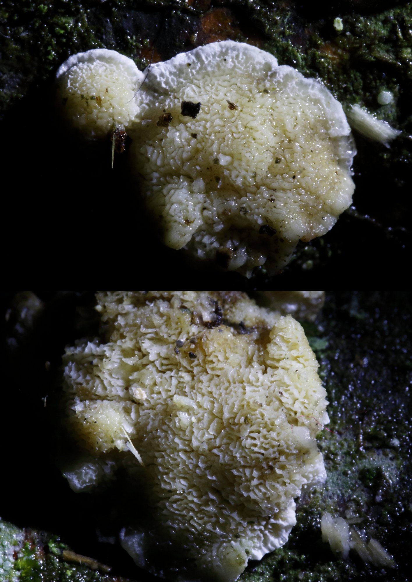 Voici un plan plus rapproché au grossissement d'une loupe qui montre deux basidiomes à deux stades de développement de l'hyménium.
