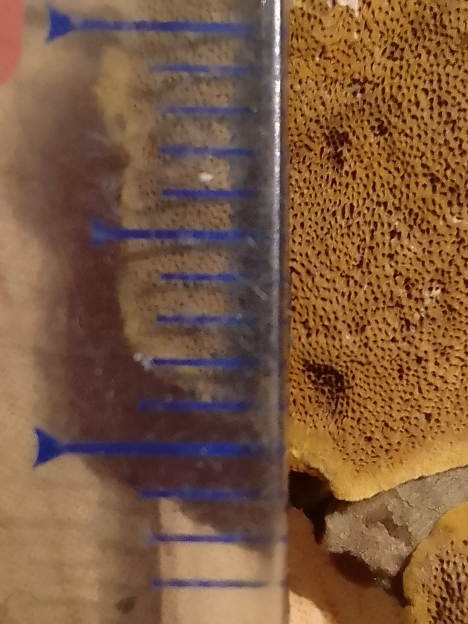 Pores circulaires. Assez fins. Hyménium brun. J'ai gardé un petit exemplaire sec que je peux charcuter avec vos précieux conseils. Mais j'ai peur qu'il n'y ait plus de spores observables.