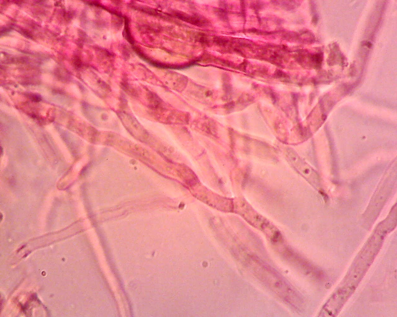 C'est bien un polypore. Le colorant n'aidant pas, on peut néanmoins affirmer qu'il s'git d'un système monomitique constitué d'hyphes à parois fines, ramifiées. Il manque les mesures ? L'épaisseur devrait être vers 4-7 µ pour Inonotus.