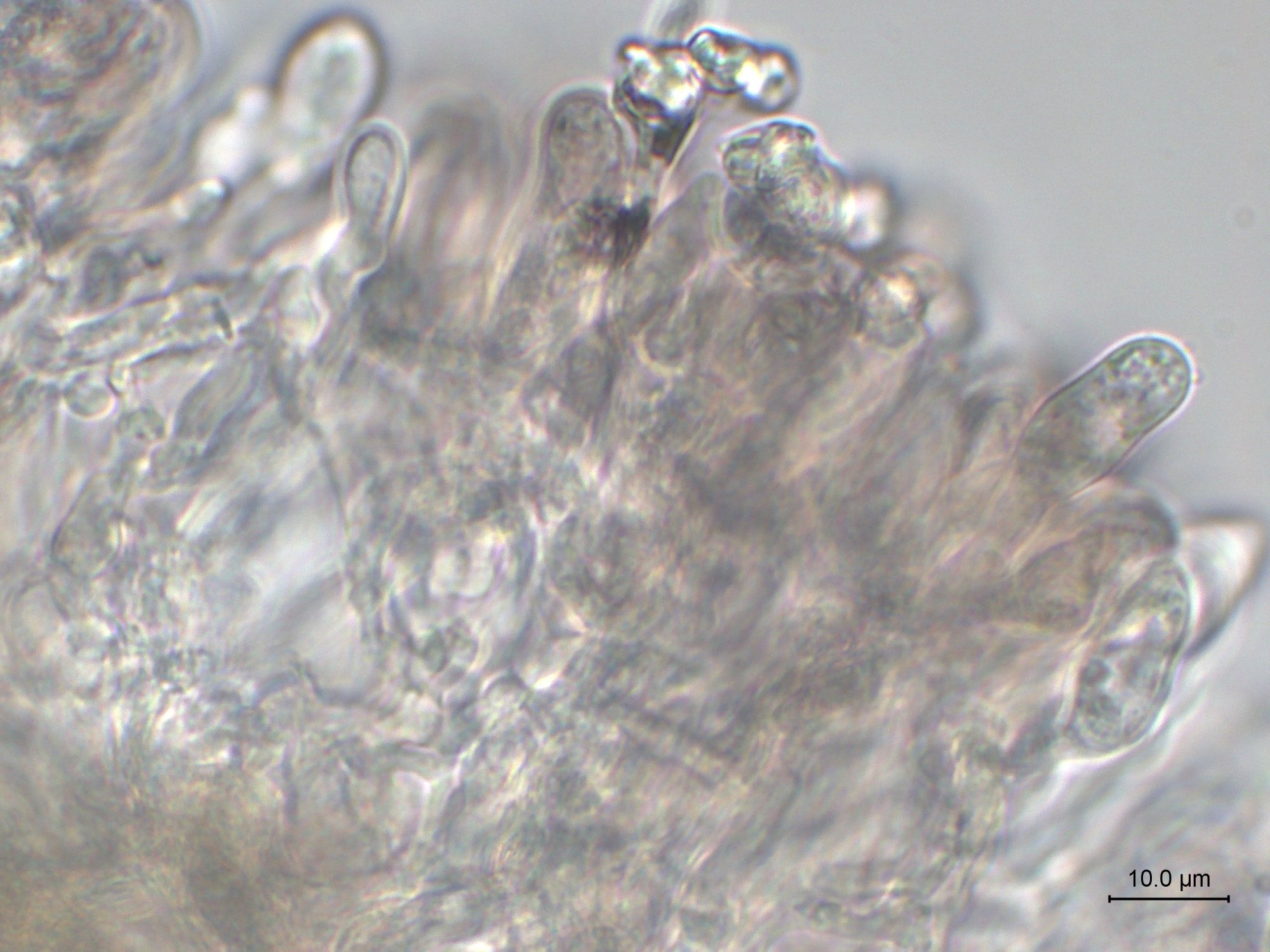 Basides clavées sinueuses bouclées (Mycocharentes parle de basides avec des gouttes huileuses, je me demande si c'est pas ça que l'on voit autour de certaines basides)