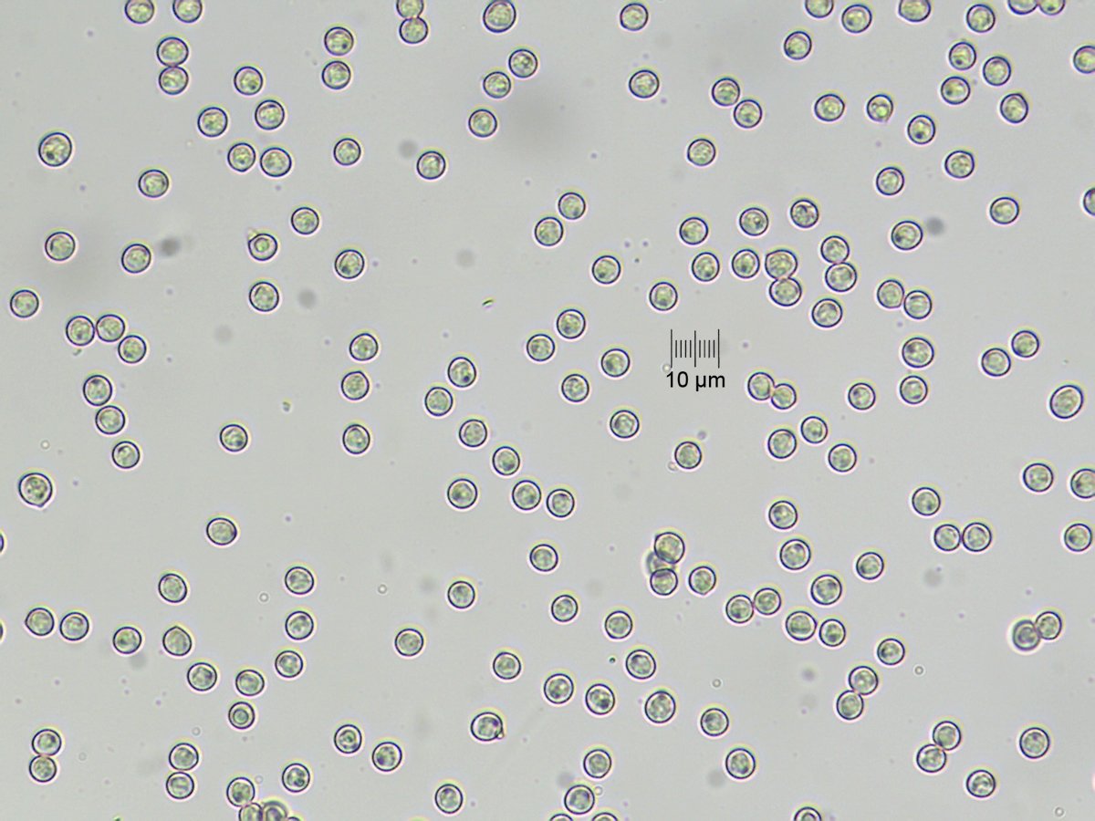 Spores globuleuses, (6,1) 6,2 - 7,1 (7,4) × (5,3) 5,6 - 6,5 (7,0) µm (Moy. 6,56 × 6,06 µm)