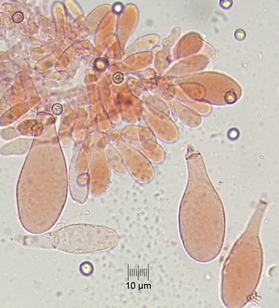 Q = (1,00) 1,02 - 1,17 (1,21) Qm = 1,08 Cheilocystides nombreuses (arête des lames stérile) de forme variable, étroitement à largement clavées, cylindriques à utriformes. Pleurocystides éparses (rares à nombreuses selon la littérature).