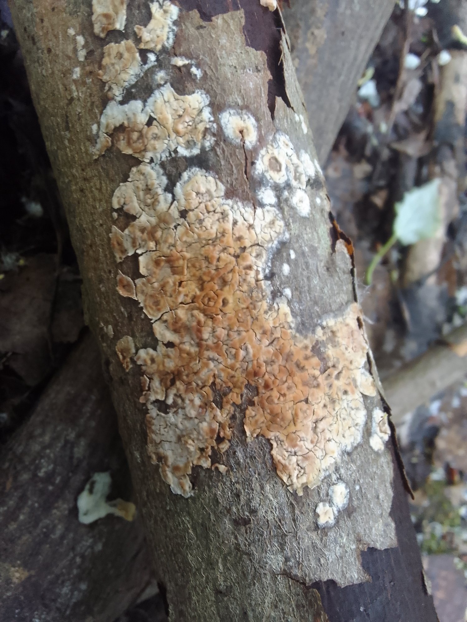 Toucher un peu cireux. Impression de volume bosselée mais épaisseur très fine. Se détachant du substrat. Sur bois avec écorce très humide, surement de peuplier. Pouvant recouvrir des grosses branches sur des dizaines de centimètres avec toujours cette aspect bosselé, non craquelé mais avec des volumes. Du crème au brun en passant par un orangé pastel, rosé par endroit. Semblant assez typique.